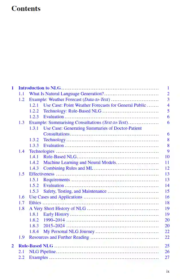 2022年末,随着先进语言模型如ChatGPT的出现,自然语言生成(NLG)技术的突出地位得到了极大的提升。尽管这些发展在学术界和商业领域引起了广泛关注,但焦点主要集中在最新的创新上,常常忽视了NLG领域丰富的历史和基础性工作。本书旨在提供NLG的全面概述,不仅涵盖语言模型,还包括替代方法、用户需求、评估方法、安全性和测试协议,以及实际应用。本书基于数十年的NLG研究,旨在为研究人员和开发者提供宝贵的资源,提供的见解将超越当前技术格局,具有持久的相关性。 自然语言生成聚焦于数据到文本的转化,但也探讨了其他类型的NLG,如文本摘要。书中采取了整体化的NLG视角,关注用户需求(用户所寻求的)、设计、数据问题、测试、评估、安全性和伦理问题以及技术等多个方面。这一整体性方法是本书的独特之处,对于构建实际应用NLG系统的开发者,以及对应用型NLG感兴趣的学术界和研究人员具有重要价值。 作者曾于2000年共同编著了一本开创性的NLG书籍,他强调了高层次的概念和方法论,确保了本书内容的长久生命力和实用性。全书结构力求平衡技术深度与实践相关性,涵盖了基于规则和神经网络的NLG方法、用户需求、严谨的评估技术和安全考虑等章节。书中还通过探讨新闻学、商业智能、摘要生成和医学等领域的实际应用,展示了NLG的潜力和可扩展性。通过作者个人的轶事和经验实例,本书为NLG这一发展中的领域提供了独特且引人入胜的视角,是那些希望利用语言生成技术力量的读者不可或缺的指南。