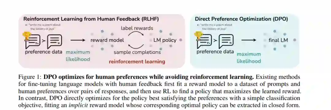 虽然大规模无监督语言模型(LMs)学习了广泛的世界知识和一些推理技能,但由于其训练的完全无监督性质,要精确控制它们的行为是困难的。现有的方法为了获得这种可操控性,会收集人类对模型生成内容相对质量的标签,并对无监督LM进行微调,使其与这些偏好一致,这通常涉及到利用人类反馈的强化学习(RLHF)。然而,RLHF是一个复杂且经常不稳定的过程,首先拟合一个反映人类偏好的奖励模型,然后使用强化学习对大型无监督LM进行微调,以最大化这个估计的奖励,同时不过分偏离原始模型。在本文中,我们介绍了RLHF中奖励模型的一种新参数化,它能够以闭合形式提取相应的最优策略,使我们能够仅使用简单的分类损失来解决标准的RLHF问题。由此产生的算法,我们称之为直接偏好优化(DPO),稳定、高效能、计算轻量,消除了在微调过程中从LM采样或进行大量超参数调整的需要。我们的实验表明,DPO可以微调LMs以与人类偏好一致,其效果与现有方法相当或更好。值得注意的是,使用DPO进行微调在控制生成内容的情感方面超过了基于PPO的RLHF,并且在摘要和单轮对话的响应质量方面达到或提高,同时在实现和训练上大大简化。