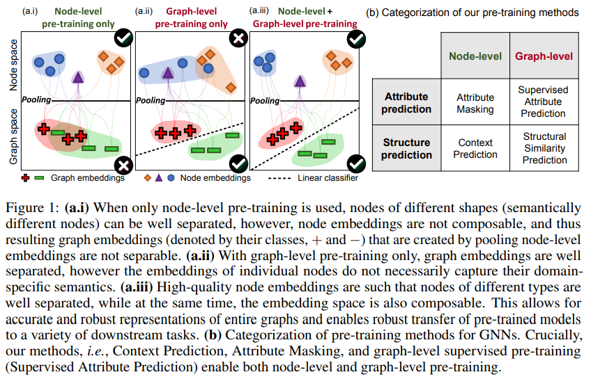 机器学习的许多应用都需要一个模型来对测试样本做出准确的预测,这些测试样本在分布上与训练示例不同,而在训练期间,特定于任务的标签很少。应对这一挑战的有效方法是,在数据丰富的相关任务上对模型进行预训练,然后在下游任务上对其进行微调。尽管预训练在许多语言和视觉领域都是有效的,但是如何在图数据集上有效地使用预训练仍是一个有待解决的问题。本文提出了一种新的图神经网络训练策略和自监督方法。我们的策略成功的关键是在单个节点以及整个图的层次上预训练一个具有强表示能力的GNN,以便GNN能够同时学习有用的局部和全局表示。我们系统地研究了多类图分类数据集的预处理问题。我们发现,在整个图或单个节点级别上对GNN进行预训练的朴素策略改进有限,甚至可能导致许多下游任务的负迁移。相比之下,我们的策略避免了负迁移,显著提高了下游任务的泛化能力,使得ROC-AUC相对于未经训练的模型提高了9.4%,实现了分子特性预测和蛋白质功能预测的最好性能。