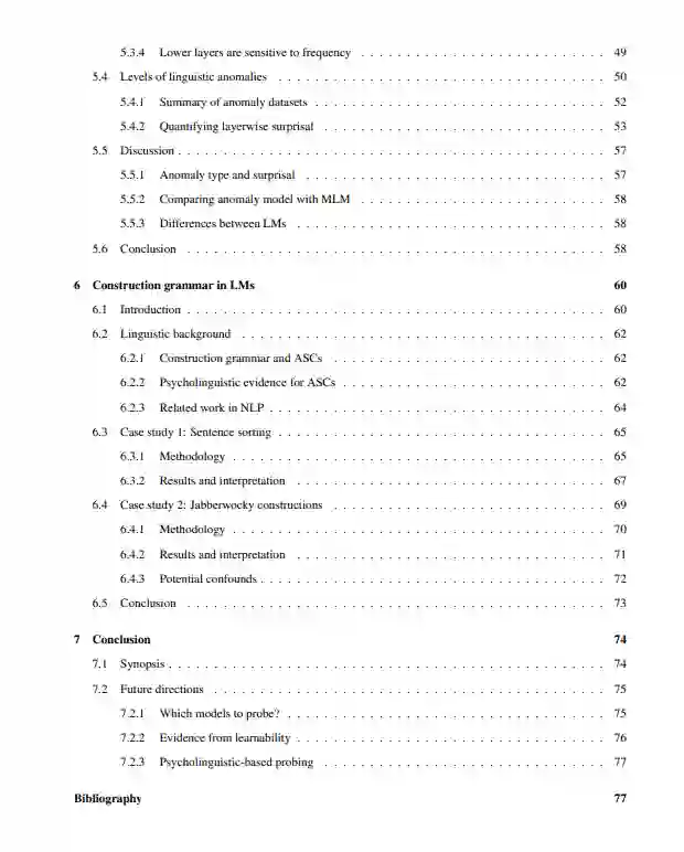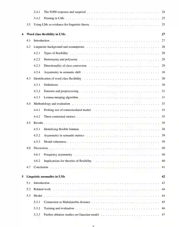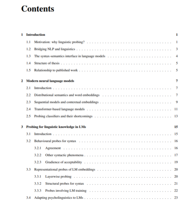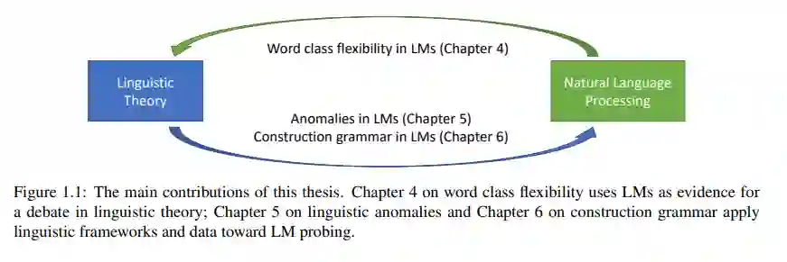 这篇论文贡献了三个研究,探讨了语言模型中语法-语义接口的不同方面。在论文的第一部分,我将语言模型应用于词类灵活性问题,这是理论语言学中一个长期争论的问题。使用mBERT作为跨多种语言的语义距离度量来源,我提出了支持将词类灵活性分析为定向过程的证据。在论文的第二部分,我提出了一种利用高斯模型进行密度估计的方法来测量语言模型中间层的惊讶度。我的实验表明,在语言模型中,包含形态句法异常的句子比语义和常识异常更早触发意外现象。最后,在我的论文的第三部分,我改编了几个心理语言学的研究,以表明语言模型包含论点结构结构的知识(从结构语法理论的动词配价分析)。总之,我的论文在自然语言处理、语言理论和心理语言学之间建立了新的联系,为语言模型的解释提供了新的视角。