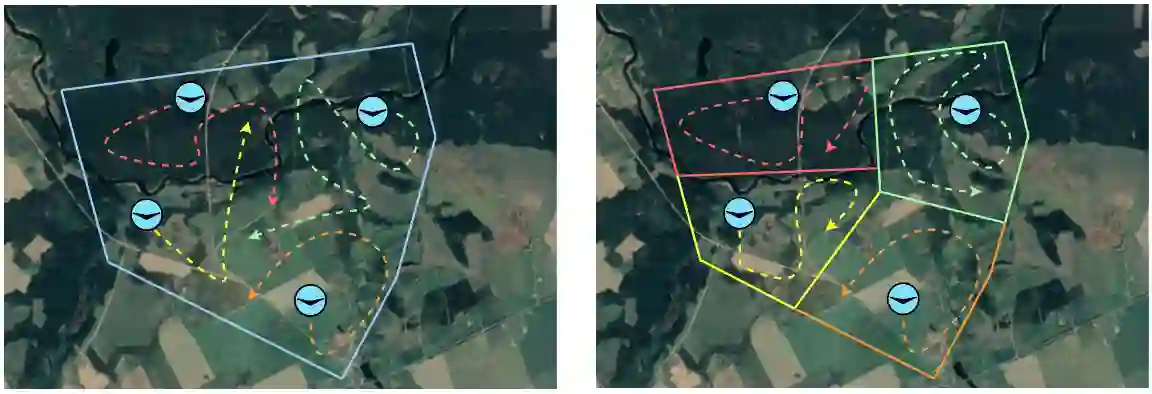 图 1.1: 将多智能体侦察问题(MARP)的 “感兴趣区域”(AOI)分割成更小的、互不关联的单智能体侦察问题(SARP)的示例