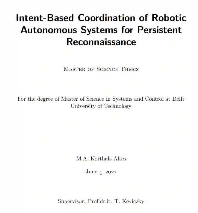 单智能体侦察问题(SARP)和多智能体侦察问题(MARP)是访问频率和覆盖水平方法的紧凑组合,用于持久侦察。根据多机器人系统(MRS)团队合作和组织方面取得的进展,提出了一种协调方法。这种协调方法将 MARP 的 AOI 划分为更小的不相交子集,这样每个无人机就可以独立解决不同的 SARP。这项研究的主要贡献在于,这种协调方法基于意图发挥作用,实现了所需的灵活性、鲁棒性和可扩展性。为此,它构建了一个监督员层次结构,在重叠子集上执行分布式合作。该分布式问题使用新颖的复杂并发约束(CCB)来解决,CCB 是并发前向约束(ConcFB)的调整版本,适用于具有复杂局部问题的分布式约束优化问题(DCOP)。此外,在分支与价格的定价步骤基础上,通过将列生成应用于重新制定的 MARP 版本,生成了一个下限来对所获得的解决方案进行基准测试。