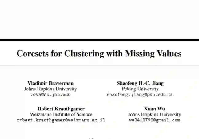 本文是《针对有缺失坐标的聚类问题的核心集(Coresets for Clustering with Missing Values)》的解读。该工作为带有多个缺失坐标的 k-聚类问题,特别是 k-means,设计第一个有理论保证的、可在近线性时间构造的核心集(coreset)。我们的核心集可以用来加速一个最近的 SODA 2021 结果,从而得到第一个带缺失坐标k-means问题的近线性时间近似方案。本工作还提供相应的实验来证明算法的实用性。