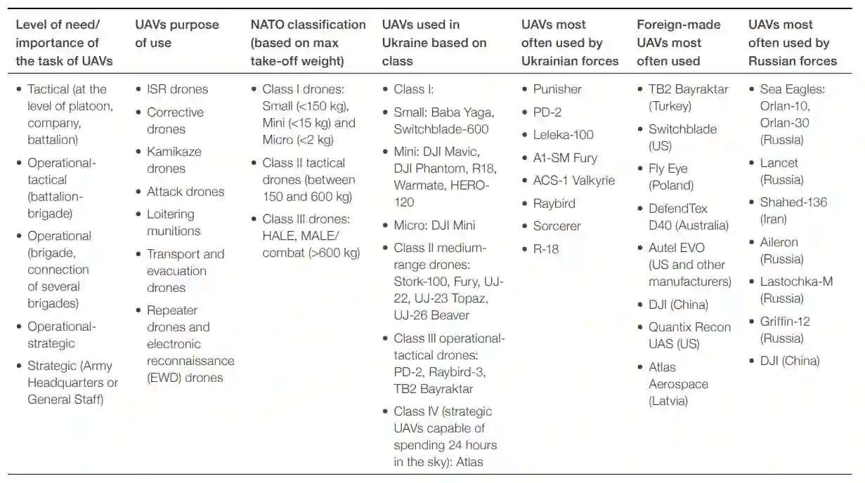 表 1. 乌克兰战争中无人驾驶飞行器的使用和分类概述