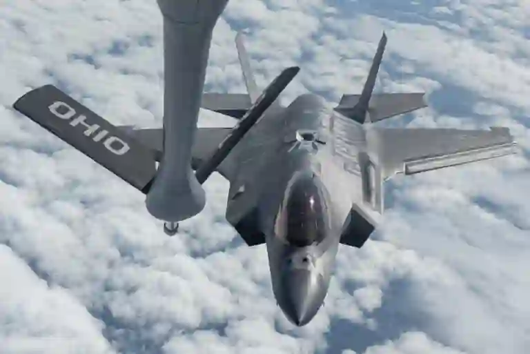 图:2025年8月24日,在哥伦布航空展上,一架美国空军F-35A与一架KC-135同温层加油机一起飞行。