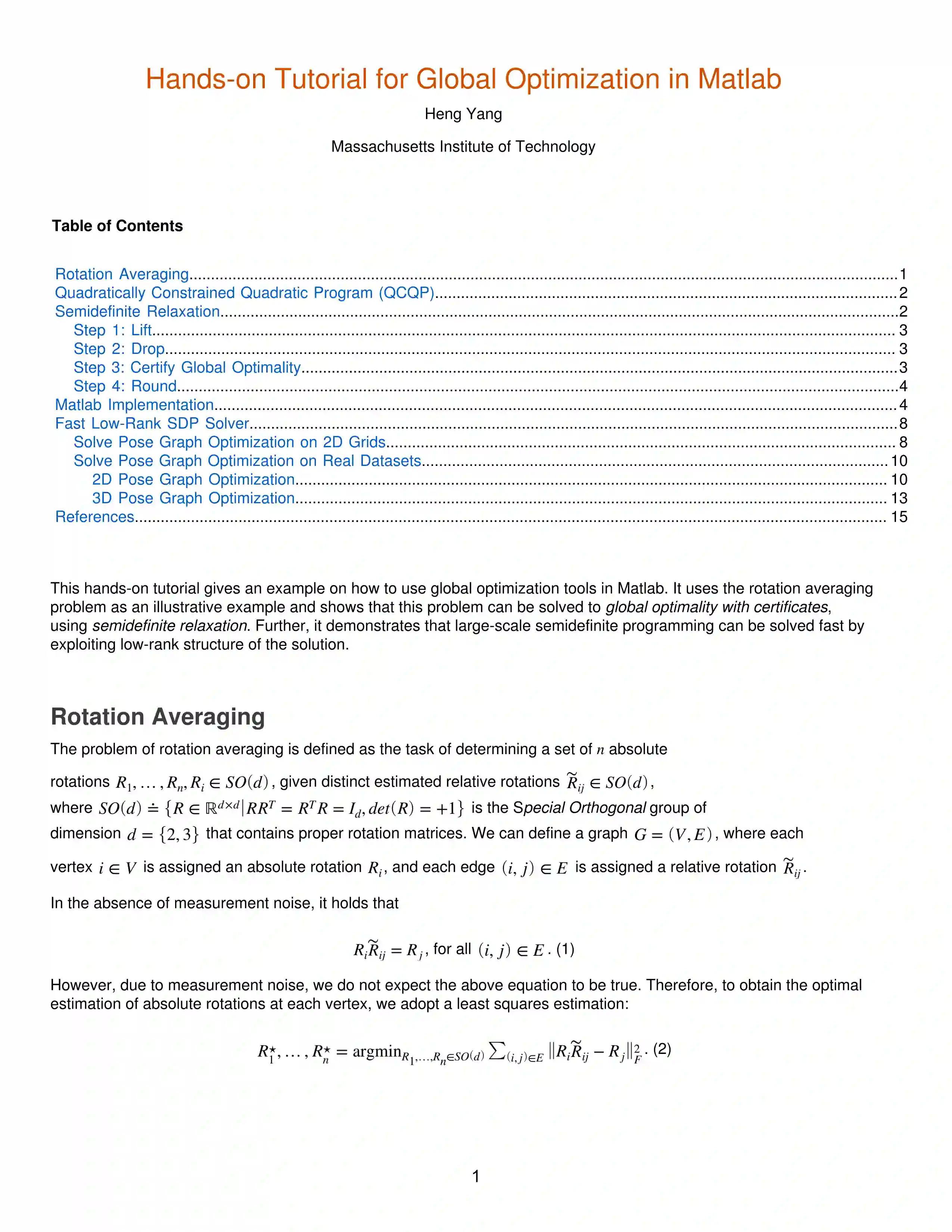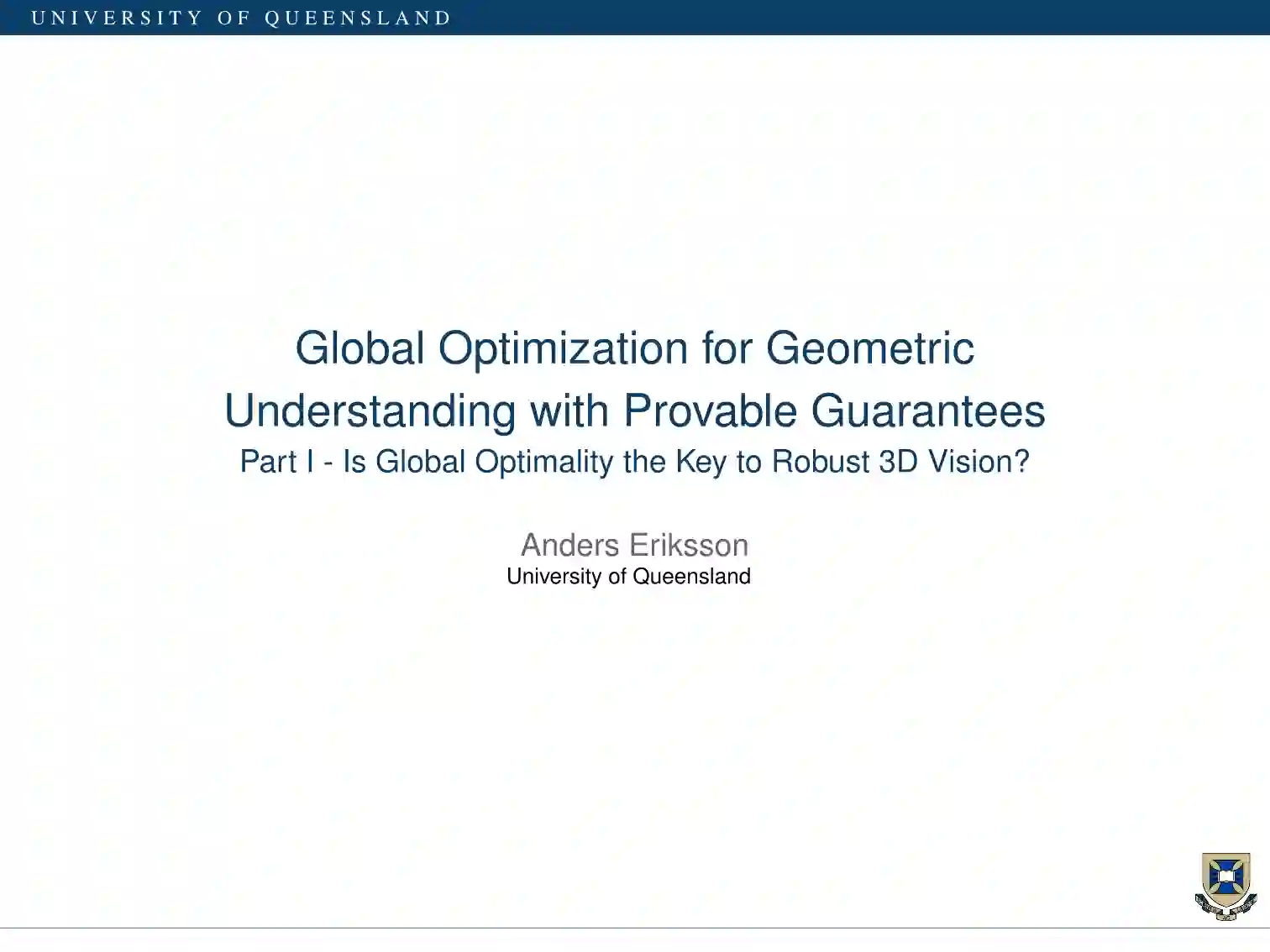 本教程旨在深入介绍适用于3D视觉问题的全局优化工具,包括凸和半正定松弛。本教程的第一个目标是通过提供真实的示例来激发对全局求解器的需求,这些示例中,由于无法解决大型优化问题而难以实现最优性,因此导致缺乏鲁棒性。第二个目标是为与会者讲解基本的数学和算法概念,并介绍该领域最近的重要进展。第三个目标是概述几种开放的研究途径:全局优化具有巨大的未开发潜力,希望本教程能够为研究人员使用现代优化工具解决几何视觉中的几个挑战带来灵感。