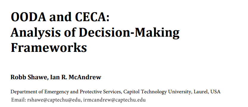 虽然该领域显示出一系列特殊性,使其与大多数行业充分不同,但在普遍接受的范例中对其进行审查仍然是可能的。然而,尽管有些理论和方法可能源自公共事业和领导力,但在执法、军事行动和应急管理中,许多理论和方法却以不同的形式出现。换句话说,只有经过某些必要的调整,才能将领导力和有效决策的普遍原则移植到应急管理领域。这些调整反映了灾难和恐怖主义应对中的不确定性、多变性和持续风险。与此同时,随着学科的不断发展,应急领导哲学的研究也经历着新时代本质所决定的类似变化。在新的国际挑战时代,应急管理领域的领军人物开始关注重新定义该领域的决策原则。本文旨在对比这方面的两个顶级框架,即 OODA 循环和 CECA,以适应当前多变的环境。