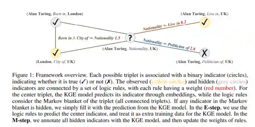知识图谱推理的目的是通过对观测到的事实进行推理来预测缺失的事实,它在许多应用中起着至关重要的作用。传统的基于逻辑规则的方法和近年来的知识图谱嵌入方法都对这一问题进行了广泛的探讨。马尔可夫逻辑网络(MLN)是一种有原则的基于规则的逻辑方法,它能够利用一阶逻辑的领域知识,同时处理不确定性。然而,由于其复杂的图形结构,MLNs的推理通常是非常困难的。与MLNs不同的是,知识图的嵌入方法(如TransE、DistMult)学习有效的实体嵌入和关系嵌入进行推理,这样更有效、更高效。然而,他们无法利用领域知识。在本文中,我们提出了概率逻辑神经网络(pLogicNet),它结合了两种方法的优点。pLogicNet使用一阶逻辑的马尔可夫逻辑网络定义所有可能的三联体的联合分布,该网络可以通过变分EM算法进行有效优化。采用知识图谱嵌入模型推断缺失的三联体,根据观测到的三联体和预测到的三联体更新逻辑规则权值。在多个知识图谱的实验证明了pLogicNet在许多竞争基线上的有效性。