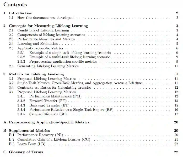 在第2节,我们介绍了终身学习情景的一般形式。这需要指定智能体可能接触到的不同类型的经验,以及应该从这些经验中产生什么指标。在第2.1节中,我们简要地概述了智能体展示终身学习的标准。在第3节中,我们定义了一套衡量标准,以描述智能体在特定场景下表现出的终身学习的程度。诸如[4, 7, 24]等资料中的讨论也有助于为终身学习背后的思想打下基础。