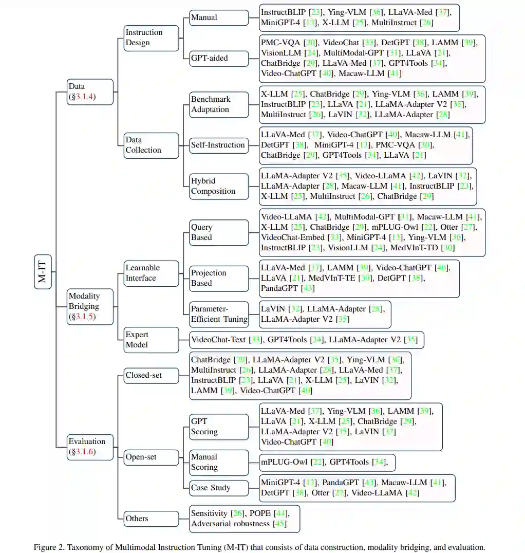 本文将近期代表性的MLLM分为四个主要类型:多模态指令微调(MIT),多模态上下文学习(M-ICL),多模态思维链(M-CoT)和LLM辅助视觉推理(LAVR)。前三者构成了MLLM的基础,而最后一个是以LLM为核心的多模态系统。请注意,这三种技术相对独立,并且可以组合使用。因此,我们对某一概念的说明可能也涉及其他内容。我们按照这四个主要类别组织本文,并依次介绍它们。我们首先详细介绍M-IT(第3.1节),以揭示在架构和数据两个方面,LLM如何适应多模态。然后,我们介绍M-ICL(第3.2节),这是一种常用于推理阶段以提升少样本性能的有效技术。另一个重要的技术是M-CoT(第3.3节),通常用于复杂的推理任务。之后,我们进一步总结LLM在LAVR(第3.4节)中主要扮演的几个角色,这通常涉及这三种技术。最后,我们以总结和潜在的研究方向结束我们的综述。