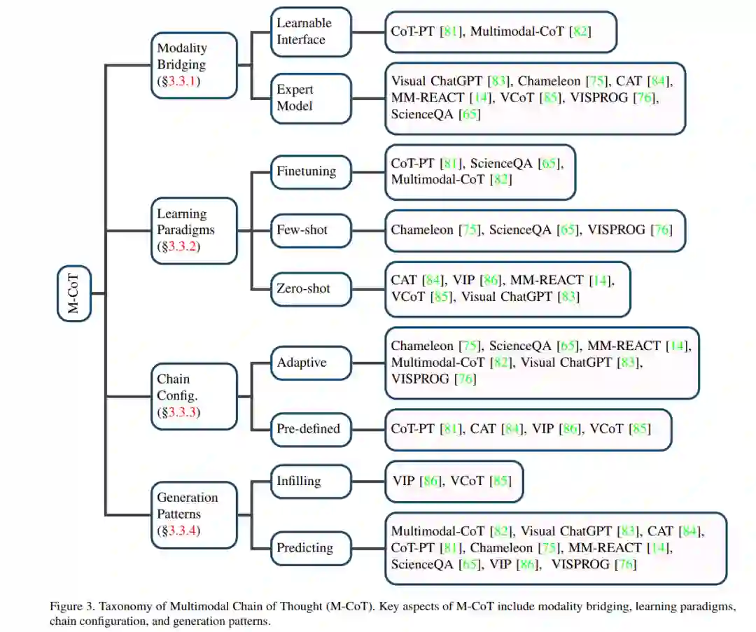 正如开创性工作[7]所指出的,CoT(Chain of Thought,思维链条)是“一系列中间推理步骤”,已被证明在复杂推理任务中是有效的[7, 87, 88]。CoT的主要思想是提示LLM不仅输出最终答案,而且输出通往答案的推理过程,类似于人类的认知过程。受NLP中的成功启发,已经提出了多项工作[81, 82, 85, 86],将单模态CoT扩展到多模态CoT(M-CoT)。我们总结这些工作如图3所示。首先,与M-IT的情况类似(见§3.1节),需要填补模态间的差距(§3.3.1节)。然后,我们介绍获取M-CoT能力的不同范例(§3.3.2节)。最后,我们详细描述M-CoT的更具体方面,包括配置(§3.3.3节)和链条的构建(§3.3.4节)。
