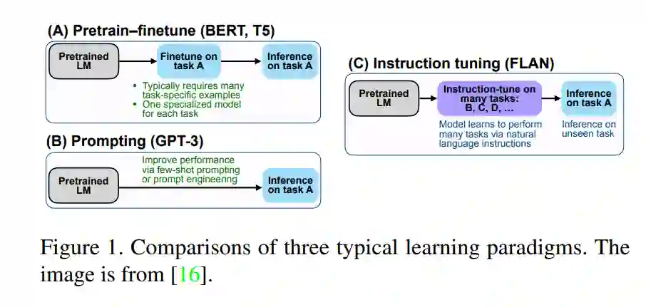 指令是对任务的描述。指令微调是一种技术,涉及在一系列指令格式的数据集[16]上对预训练的大型语言模型进行微调。通过这种方式调整,LLM可以通过遵循新的指令来泛化到未见过的任务,从而提升零样本性能。这个简单而有效的想法引发了后续在NLP领域的成功作品,如ChatGPT [1]、InstructGPT [17]、FLAN [16, 18]和OPT-IML [19]。图1说明了指令微调与相关典型学习范例之间的比较。监督微调方法通常需要大量特定任务的数据来训练特定任务的模型。提示方法减少了对大规模数据的依赖,并可以通过提示工程完成专门的任务。在这种情况下,尽管少样本性能得到改善,但零样本性能仍然相当一般[5]。不同的是,指令调整学习如何泛化到未见过的任务,而不是像两个对应方法那样适应特定任务。此外,指令调整与多任务提示[20]高度相关。