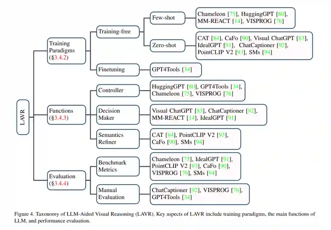 接下来的部分按照图4所示进行组织:我们首先介绍在构建LLM辅助视觉推理系统中使用的不同训练范例(§3.4.2节)。随后,我们深入探讨LLM在这些系统中扮演的主要角色(§3.4.3节)。最后,我们以各种类型的性能评估来结束我们的讨论。