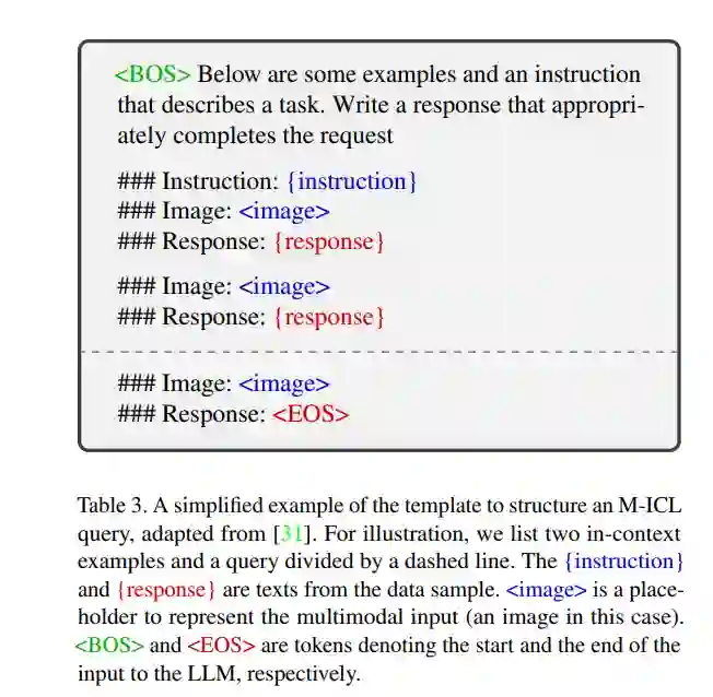 ICL(In-Context Learning,上下文中学习)是LLM的重要能力之一。ICL有两个优点:(1) 与从大量数据中学习隐含模式的传统监督学习范式不同,ICL的关键是通过类比学习[74]。具体来说,在ICL设置中,LLM通过少量示例以及可选的指令学习,并对新问题进行外推,从而以少样本的方式解决复杂和未见过的任务[14, 75, 76]。 (2) ICL通常以无需训练的方式实现[74],因此可以灵活地在推理阶段集成到不同的框架中。与ICL密切相关的技术是指令微调(见第3.1节),经验证明可以增强ICL能力[16]。在MLLM的背景下,ICL已扩展到更多模态,从而形成多模态ICL(M-ICL)。在(第3.1.2节)中的设置基础上,在推理时,可以通过添加演示集,即一组上下文样本,来实现M-ICL。在这种情况下,模板可以扩展为表3所示。注意,我们列出了两个上下文示例作为说明,但示例的数量和顺序可以灵活调整。实际上,模型通常对示例的排列敏感[74, 77]。在多模态应用方面,M-ICL主要用于两种场景:(1) 解决各种视觉推理任务[14, 27, 63, 78, 79];(2) 教LLM使用外部工具[75, 76, 80]。前者通常涉及从少量特定任务的示例中学习,并推广到新的但相似的问题。从指令和演示中提供的信息中,LLM了解任务的内容和输出模板,并最终生成预期答案。相比之下,工具使用的示例通常仅为文本,并且更加细致。它们通常包括一系列可以按顺序执行以完成任务的步骤。因此,第二种情况与CoT(见第3.3节)密切相关。