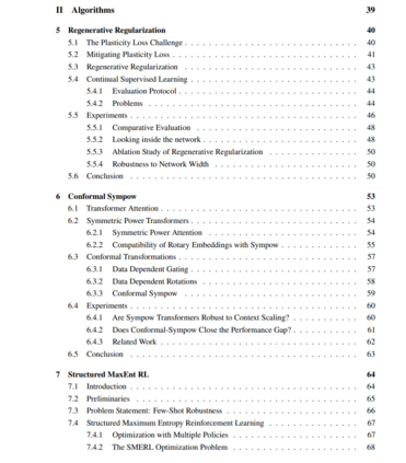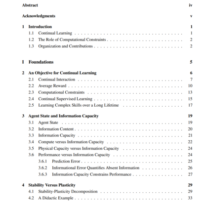 持续学习依然是机器学习领域的一项长期挑战。成功实现持续学习需要不断吸收新的知识,同时保留仍然有用的旧知识。在本论文中,我们提出了一种连贯的持续学习目标:在每个时间步受到计算资源限制的前提下,最大化无限时域平均回报。这一框架使我们能够系统性地分析持续学习智能体的设计与评估,超越仅仅依赖准确率保持或可塑性等零散指标的方法。 论文的第一部分聚焦于基础工具与理论视角的构建,包括:对智能体状态的信息论建模、智能体容量的量化方法,以及持续学习中稳定性–可塑性权衡的形式化定义。第二部分则提出了多种新算法:一种用于缓解神经网络可塑性退化的再生式正则化方法;Conformal Sympow——一种基于Transformer的模型,借助学习型门控与数据依赖旋转机制,实现了高效的长上下文推理;以及一种以多样性驱动的强化学习方法,使智能体具备对环境扰动的少样本鲁棒性。