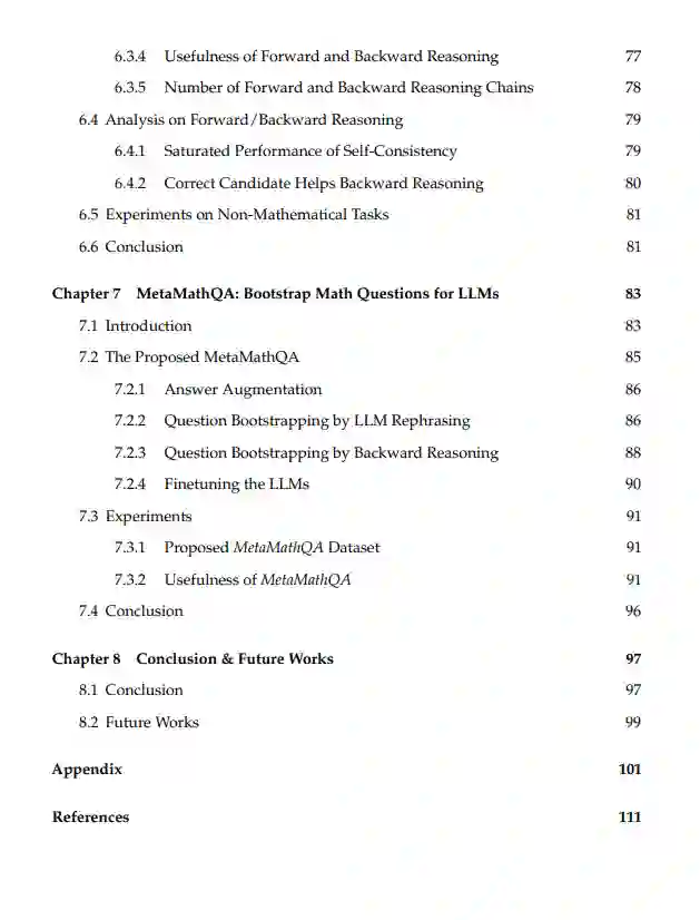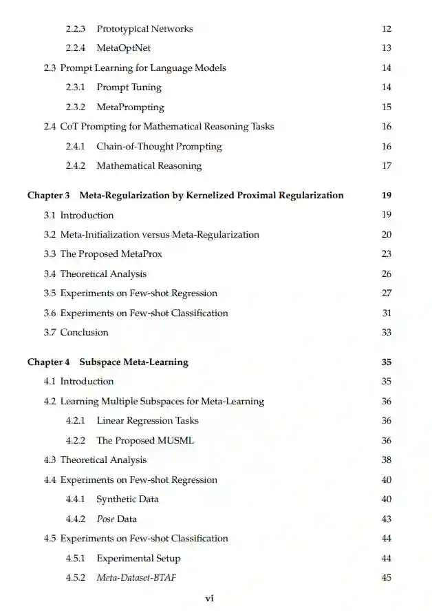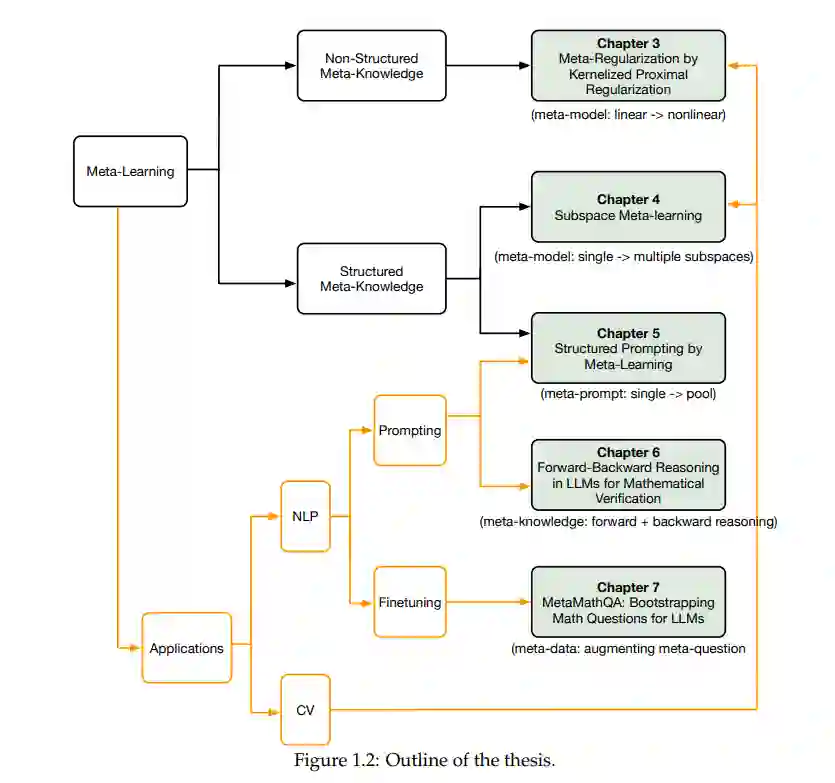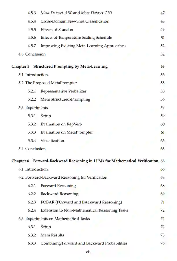 首先,我们通过核化近端正则化将线性模型的有效元正则化扩展到非线性模型,从而使得像深度网络这样更强大的模型能够处理复杂任务。 其次,我们将特定任务的模型参数形式化为一个子空间混合,并提出了一种模型无关的元学习算法来学习子空间基。每个子空间代表一种类型的元知识,结构化的元知识比简单的元模型更有效地加速复杂任务的学习。 第三,我们提出了一种高效且参数优化的元学习算法,用于自然语言处理任务中的提示调优。该算法学习一组多个元提示,从元训练任务中提取元知识,然后通过注意力机制将所有元提示的加权组合构建为实例依赖的提示。实例依赖的提示具有灵活性和强大功能,能够有效地处理复杂任务的提示。 接下来,我们使用大语言模型(LLM)研究数学推理任务。为了验证由LLM生成的候选答案,我们提出将前向和后向推理的元知识结合起来。 最后,我们提出了问题增强方法,通过扩展问题集来训练LLM,从而增强LLM的数学推理元知识。原始问题通过两个方向进行增强:在前向方向,我们通过少样本提示重新表述问题;在后向方向,我们对问题中的数字进行掩蔽,并创建一个反向问题,通过答案预测被掩蔽的数字。