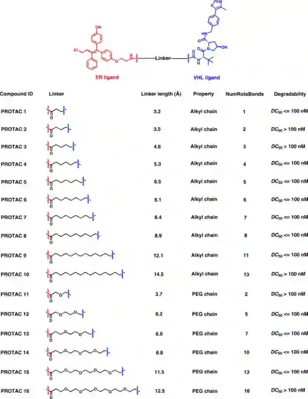 化合物PROTAC 2,PROTAC 6和PROTAC 10分别被证实是坏降解剂,好降解剂和坏降解剂。它们的接头长度计算为3.5、8.1和14.5 Å,分别代表短、中、长烷基接头(图7)。因此,他们被选中通过PRosettaC和分子动力学(MD)模拟构建三元复合物。