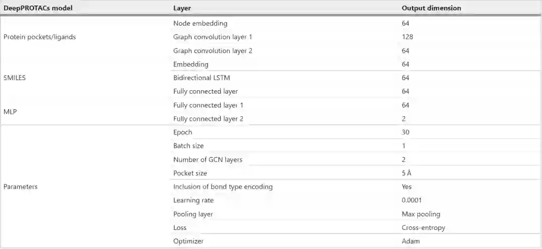 本文用PyTorch和PyTorch几何框架实现了整个网络。在本文的实验中,所有的GCNs都由两个图卷积层和一个最大池化层组成。每个最大池的输出口袋/配体表示的维数为64。此外,将连接子SMILES的编码输入嵌入层以获得分布式表示。然后,该嵌入层的输出依次在64 个节点和全连接层的双向 LSTM 层中馈送。连接子SMILES网络模块的输出表示也具有64维。该连接子网络的结果与口袋/配体网络的结果相连接,然后被送入具有两个完全连接层的MLP以获得最终输出。该网络采用渗漏整流线性单元(Leaky ReLU)作为激活函数。注意,POI口袋和E3口袋的GCNs的重量是共享的,弹头和E3配体的GCNs的重量也是共享的。表1列出了 DeepPROTACs 模型中使用的每层的详细输出尺寸和超参数。