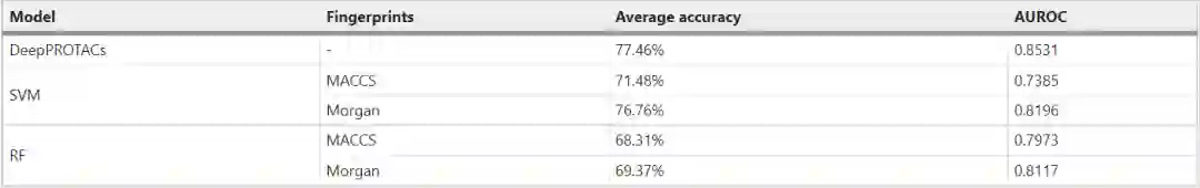 表3:DeepPROTAC、SVM和RF模型在测试集上的评估结果