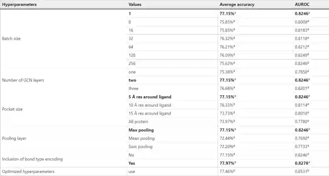 模型参数的优化 每个实验中,整个数据集以8:1:1的比例随机分为训练集、验证集和测试集。最终,该模型在验证集上达到了 77.15% 的平均准确率。本文还研究了GCN层数的影响,并观察到层数为2的最佳性能(表2)。通过逐渐扩大口袋大小来研究口袋大小对模型的影响。如表2中所列,使用5 Å口袋尺寸的型号性能最佳。5 Å大小的口袋仅包含配体周围的第一和第二配位壳残基,这些残基在POI/弹头和E3/配体结构中已知。此外,加入最大池化层和键类型编码可提高模型的性能(表2)。最终模型由表1中列出的优化参数和 Adam 优化器训练学习率为 0.0001,β1 为 0.9,β2 为 0.999。