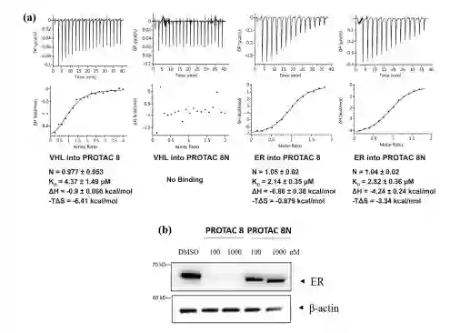 蛋白质印迹数据(图8和表4)显示,11种化合物(PROTAC 1、PROTAC 4 ~ 9、PROTAC 12 ~ 15)在16小时内诱导浓度低于100nM的ER降解非常有潜力。因此,它们被认为是良好的降解剂。其他5种PROTAC (PROTAC 2 - 3, PROTAC 10 -11, PROTAC 16)在指定浓度下降解ER的效果较差或无效,这意味着它们属于不良降解剂。在T-47D细胞系中对PROTAC 8及其阴性类似物PROTAC 8N(含VHL配体的非活性异构体)进行VHL/ER结合试验和蛋白质印迹分析。