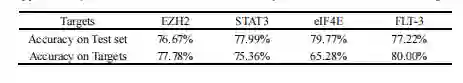 将表6的靶标(EZH2、STAT3、eIF4E和FLT-3)视为新靶标,以进一步检验模型的泛化能力。测试集上的所有预测精度都非常相似,在 77% 的值左右波动。特定目标的准确度在65%到80%之间变化,说明本文的模型具有良好的泛化能力。