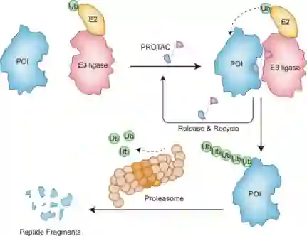 蛋白水解靶向嵌合体(PROTACs)自2001年诞生以来,已成为利用事件驱动MOA的一项十分具有吸引力的技术。PROTAC是一种特异性双功能分子,由一个靶蛋白(POI)配体、一个连接子和一个E3泛素连接酶配体组成。它通过将泛素化机制带到POI附近来促进三元复合物(POI-PROTAC-E3)的形成,驱动泛素从E2泛素结合酶转移到靶蛋白上并与表面的赖氨酸共价结合。随后,泛素化标记的POI被26 S蛋白酶体识别并降解为短肽甚至氨基酸(图1)。
