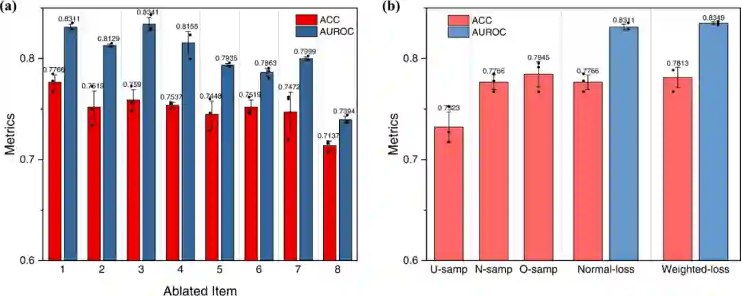 本文发现,PROTAC分子的活性分布在不同对靶蛋白和E3连接酶之间差异很大。因此,在单个特定的靶蛋白和E3连接酶之间几乎不可能实现数据平衡。相反,本文试图研究数据平衡对整个数据集的影响。在每种采样方法中,本文对模型进行了三次训练,得到了平均预测精度和AUROC。本文的实验结果表明,过采样方法的性能最好,其次是正态采样和欠采样(图6b)。因为过采样充分利用了有限的数据,而欠采样浪费了一些数据资源。此外,加权损失也被用来作为另一种方法来改善数据不平衡的影响。这些结果说明了数据不平衡的问题在本研究中确实存在,而试图解决这一问题的努力只能在一定程度上提高模型的性能。因此,考虑到性能和计算成本之间的平衡,本文采用默认设置(正态采样和正态损失)来训练最终的DeepPROTACs模型。