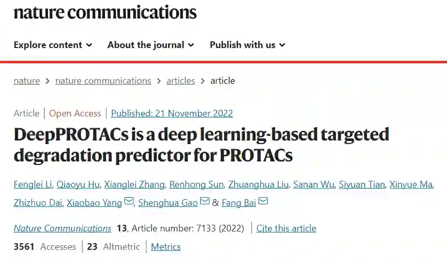 参考资料 Li, F., Hu, Q., Zhang, X. et al. DeepPROTACs is a deep learning-based targeted degradation predictor for PROTACs. Nat Commun 13, 7133 (2022). https://doi.org/10.1038/s41467-022-34807-3