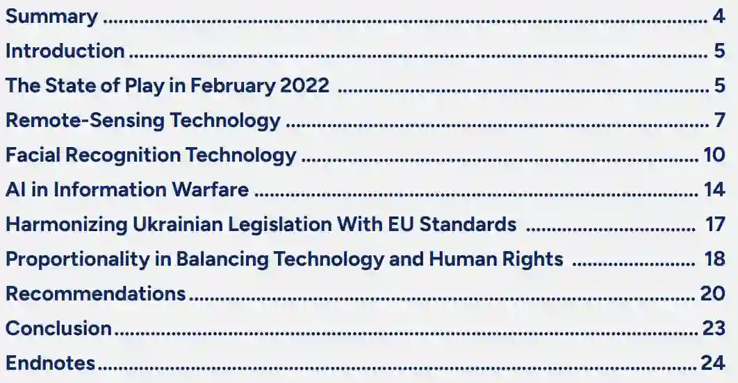 这些关键技术需要严格的保障措施,以保护乌克兰民主价值观和人权。为此提出的主要建议包括:对遥感技术进行监管;使该国的人工智能和数据保护法律与欧盟标准相一致;采用影响评估框架;为人工智能创新的安全开发、测试和改造创建 “监管沙盒”;以及加强媒体扫盲计划,抵制人工智能产生的虚假信息。通过这些措施,乌克兰可以利用先进技术进行国防和重建,同时确保战时措施不会破坏其民主未来。