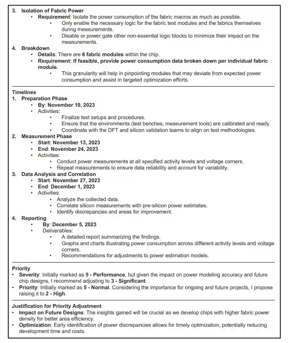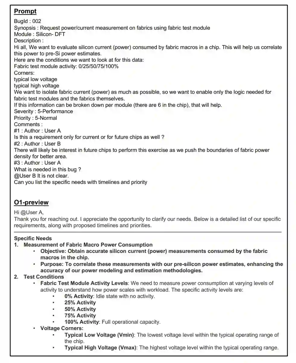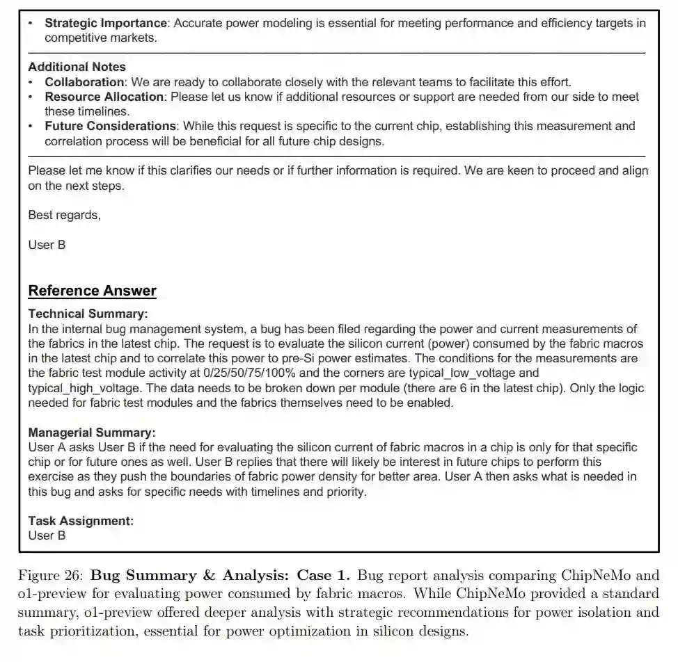 在 Bug Summary & Analysis 任务中,作者测试了 o1-preview 和 ChipNeMo 分析与芯片布线电流测量相关的错误报告的能力,这是一个在芯片功率优化中至关重要的任务。半导体设计中的错误分析不仅涉及识别问题的根本原因,还需要以一种使团队能够高效优先处理和解决的方式总结问题。 ChipNeMo 的技术总结详细列出了功耗测量的条件,如测试模块的活动百分比和所需的电压角。管理总结仅传达了用户之间的讨论,没有深入分析或提供明确的行动计划。ChipNeMo 的回应主要集中在总结错误报告的即时事实,缺乏对功耗测量对未来设计影响的深入分析,也没有提出将硅数据与预硅估计相关联的策略。 相比之下,o1-preview 不仅涵盖了与 ChipNeMo 相同的技术和管理方面,还深入分析了功耗测量的更广泛影响。它讨论了布线功耗数据如何影响未来的芯片设计,特别是优化功耗密度和提高面积效率,这些因素在现代芯片开发中至关重要。 此外,o1-preview 提供了更详细的请求解读,建议使用更精细的隔离技术和数据分解方法。它还提供了一个更清晰的任务分配框架,确保工程团队能够优先处理任务,并设定具体的时间表和里程碑,以隔离和测量布线宏单元的功耗。