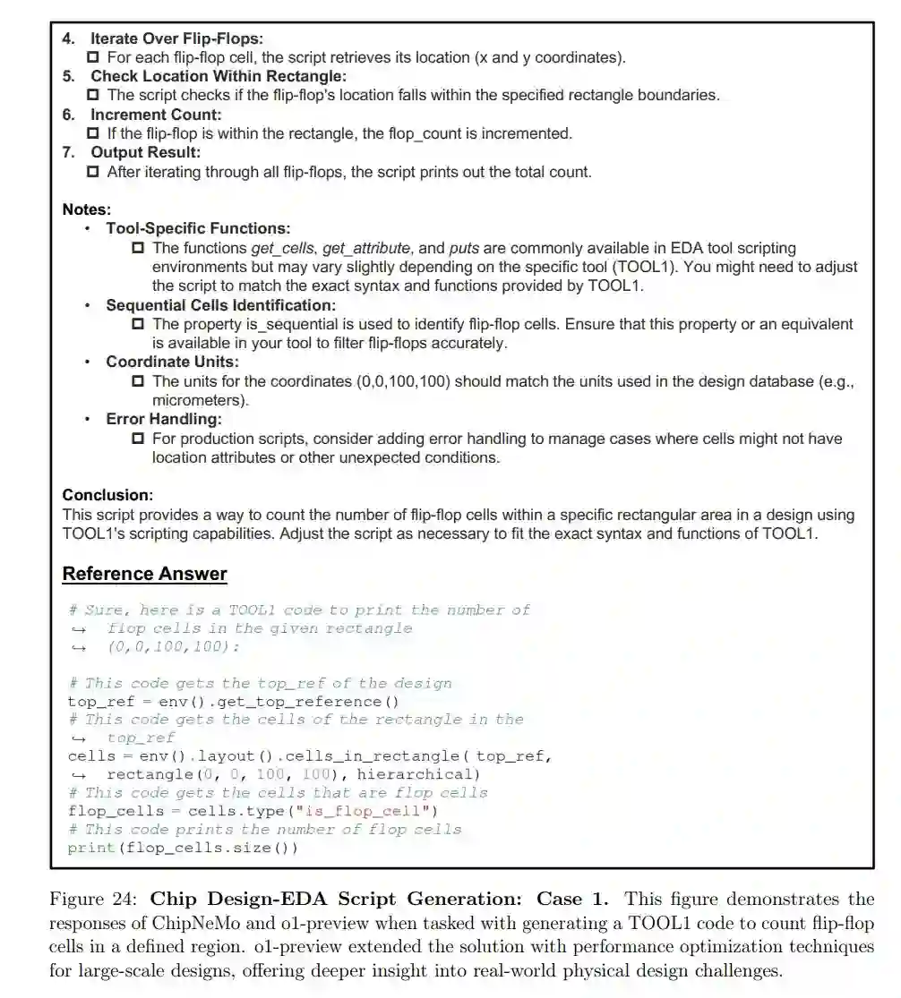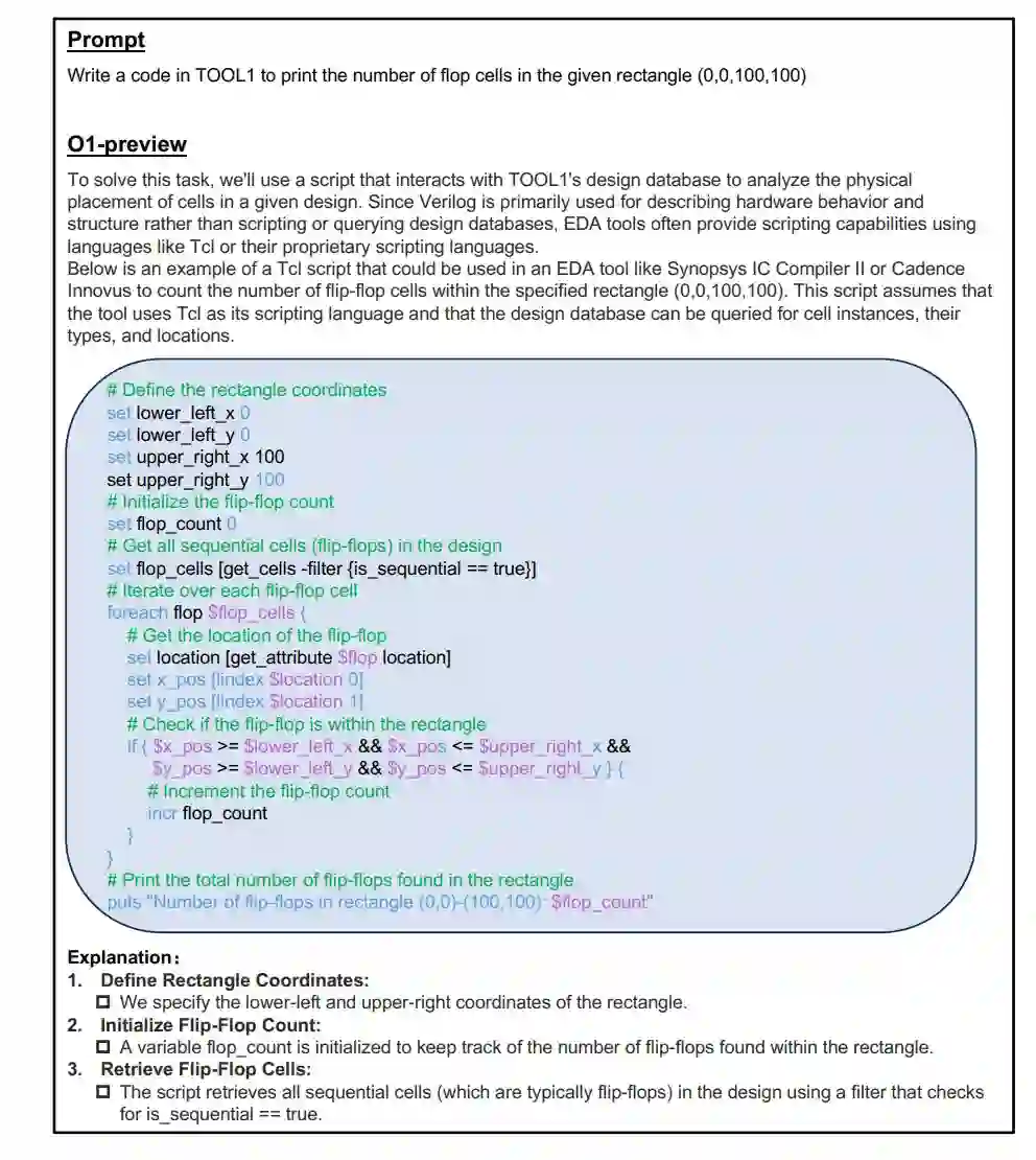 在 EDA 脚本生成任务中,作者测试了 o1-preview 和 ChipNeMo 生成 EDA 工具脚本的能力。 在图 24 所示的第一个例子中,任务是编写 TOOL1 代码来统计给定矩形边界内的触发器单元数量,这是物理设计中常见的操作,用于确定逻辑分布和优化布局。ChipNeMo 的回应提供了一个基本的解决方案,涵盖了如何遍历设计层次结构并在指定区域内计数触发器的基本机制。虽然其结构和功能正确,但灵活性有限,未涉及处理边缘情况(如重叠区域或边界条件)或优化搜索算法以适应更大设计的高级特性,这些在生产环境中是至关重要的。 相比之下,o1-preview 的回应更为细致。除了提供核心代码外,o1-preview 还讨论了潜在的优化策略,如如何高效遍历大型设计和更优雅地处理边界条件。此外,o1-preview 还包括了扩展功能的注释和建议,如添加计数其他类型单元的功能或将脚本集成到更大的设计规则检查自动化流程中。这一回应展示了对实际 EDA 环境中复杂性的深刻理解,强调了灵活性和可扩展性的重要性。o1-preview 能够预见工程师在大规模设计中部署此脚本时可能遇到的问题,使其回应在专业环境中更具实用性。