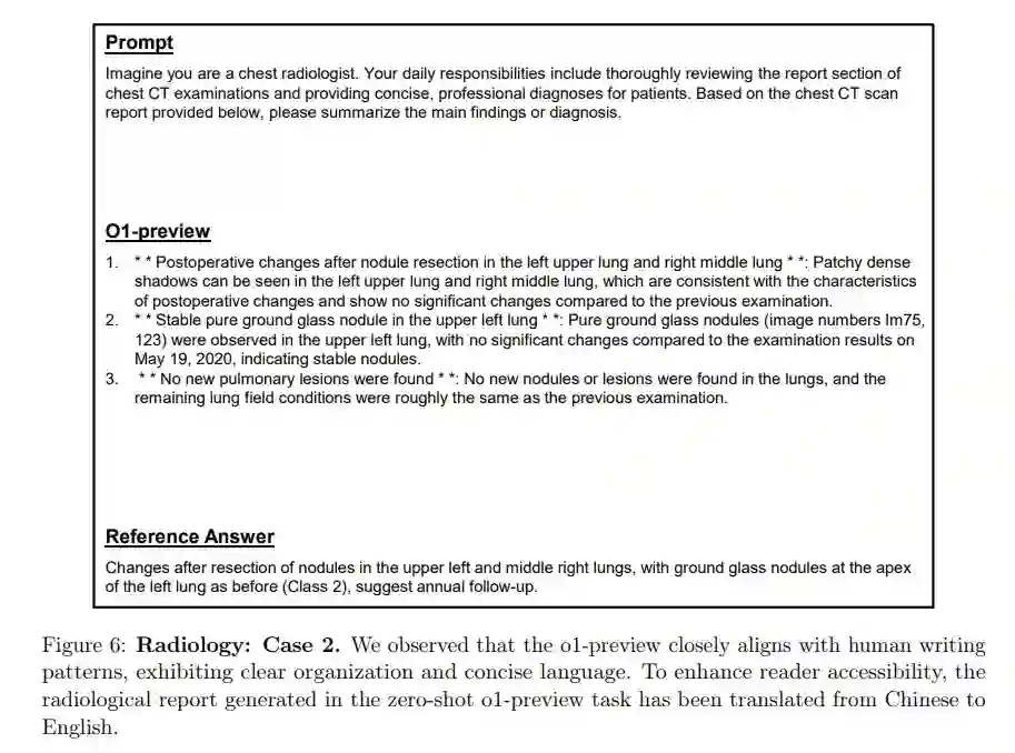 如表 3 所示,与医生撰写的报告相比,o1-preview 生成的报告的 ROUGE 评分为:R-1: 0.3019, R-2: 0.0448, R-L: 0.2841,在 6 种模型中排名最高。值得注意的是,o1-preview 的平均报告生成时间也最长,为 15.051 秒。 图 5 和图 6 展示了两个例子,说明了作者对放射学报告生成的评估结果。在评估过程中,o1-preview 展示了在零样本情况下快速生成可靠放射学报告的能力,突显了其强大的推理和知识迁移能力,以及在医疗领域的潜力。作者观察到,o1-preview 的报告与人类写作模式高度一致,结构清晰,语言简洁。尽管其他模型未能达到最高的相似度分数,但大多数模型能够遵循指令并完成任务。