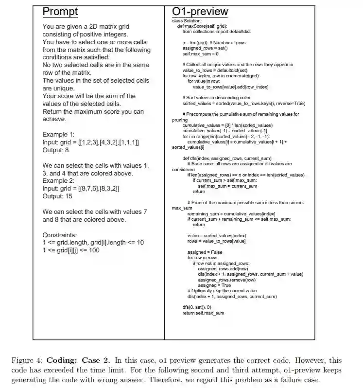 尽管存在这些挑战,但与顶级人类竞争者相比,01 -preview 展示了相当或更快的代码生成速度。这说明 01 -preview 具有较强的推理能力,可以有效处理大部分的编码任务。然而,在特别复杂或计算密集的情况下,模型的性能仍然有限,正如在这些困难的问题中观察到的那样。 图 3 和图 4 演示了编码评估中的两个示例。在图 3 中,01 -preview 展示了它有效解决简单问题的能力,用最少的计算时间完成任务并成功通过所有测试用例。然而,如图 4 所示,该模型遇到了一个难题。在这个失败案例中,01 -preview 最初生成了一个正确的解决方案,但是解决方案超出了时间限制。在第一次提交之后,模型陷入了试图优化代码时间复杂度的循环中,这在随后的尝试中导致了不正确的解决方案。这个例子突出了该模型在处理需要显著优化的复杂问题时的挣扎,它为提高效率所做的努力导致了重复的错误。