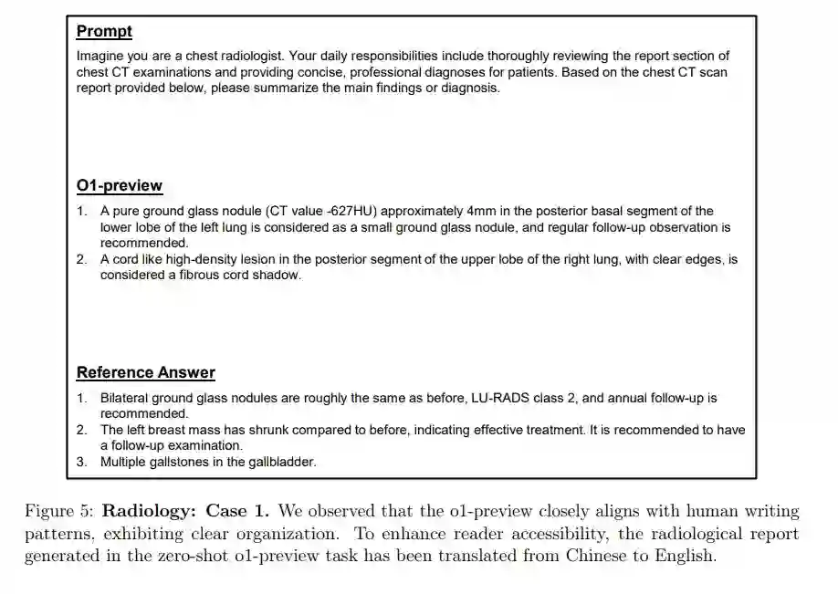 为了评估 o1-preview 的医学报告生成能力,作者使用了来自中南大学湘雅二医院的中文放射学报告数据集 SXY。它包含 317,339 份放射学报告,分为五个类别:胸部报告、腹部报告、肌肉骨骼报告、头部报告和头颈面部报告。 作者通过比较 o1-preview 与基线模型(如 gpt-4-turbo、gpt-4o 等)的 ROUGE 指标,评估了 o1-preview 生成医学报告的能力。表 3 提供了 o1-preview 与另外五种模型的详细性能对比。