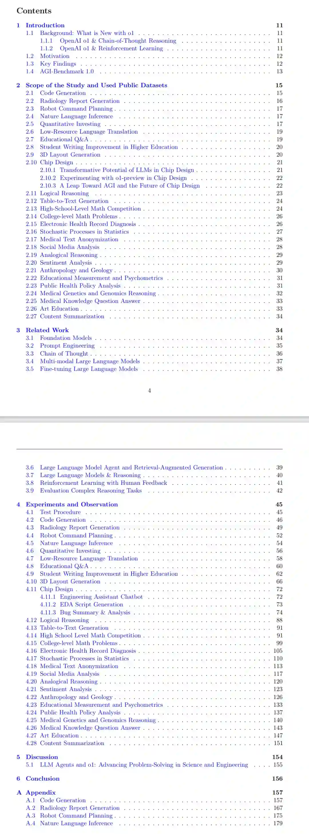 尽管 o1-preview 在一些简单的问题上偶尔会出现错误,并且在某些高度专业的概念面前遇到了挑战,但总体结果表明,该模型在向通用人工智能(AGI)迈进的过程中取得了显著进展。 评估不仅突显了 o1-preview 目前的优势和局限性,还指出了未来发展的关键领域,如多模态集成、特定领域的验证和实际应用中的伦理考虑。这些发现为大型语言模型在众多领域的潜力提供了宝贵的见解,并为 AI 研究和应用的进一步发展铺平了道路。 论文目录如下: