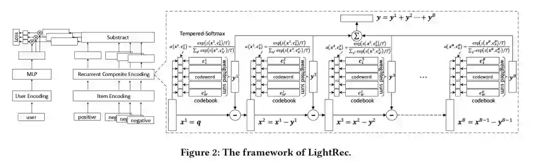 摘要:近年来,深度推荐系统已经取得了显着的进步。尽管具有出色的排名精度,但实际上运行效率和内存消耗在现实中却是严重的瓶颈。为了克服这两个瓶颈,我们提出了LightRec,这是一个轻量级的推荐系统,具有快速的在线推断功能和经济的内存消耗。LightRec的主干是总共B个codebooks,每个codebook均由W个潜在向量组成,称为codewords。在这种结构的顶部,LightRec将有一个商品表示为B codewords的加法组合,这些B codewords是从每个codebook中选择的最佳的。为了有效地从数据中学习codebooks,我们设计了一个端到端的学习工作流程,其中所提出的技术克服了固有差异性和多样性方面的挑战。另外,为了进一步提高表示质量,采用了几种distillation策略,可以更好地保留用户-商品的相关性得分和相对排名顺序。我们对LightRec在四个真实数据集上进行了广泛评估,得出了两个经验发现:1)与最先进的轻量级baseline相比,LightRec在召回性能方面取得了超过11%的相对改进;2)与传统推荐算法相比,在top-k推荐算法中,LightRec的精度下降幅度可以忽略不计,但速度提高了27倍以上。