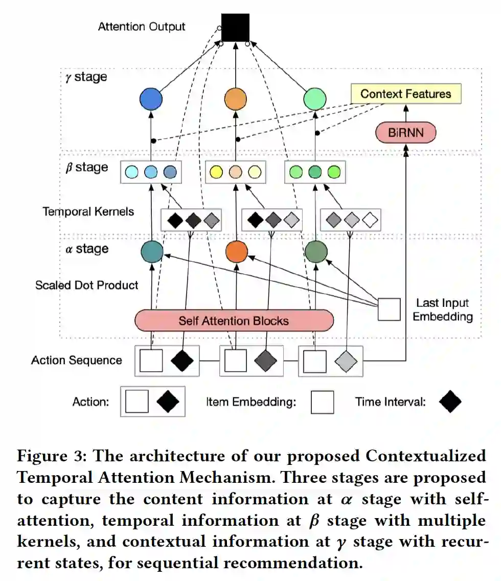 摘要:根据用户的历史连续行为预测用户的偏好对于现代推荐系统来说是具有挑战性的,也是至关重要的。现有的序列推荐算法在建模历史事件对当前预测的影响时,大多侧重于序列行为之间的过渡结构,而很大程度上忽略了时间和上下文信息。在这篇文章中,我们认为过去的事件对用户当前行为的影响应该随着时间的推移和不同的背景而变化。因此,我们提出了一种情境时间注意力机制(Contextualized Temporal Attention),该机制可以学习权衡历史行为在行为以及行为发生的时间和方式上的影响。更具体地说,为了动态地校准来自自注意力机制的相对输入的依赖关系,我们提出了多个参数化的核函数以学习各种时间动态,然后使用上下文信息来确定每个输入要跟随哪一个kernel( reweighing kernels )。在对两个大型公开推荐数据集进行的实证评估中,我们的模型始终优于一系列最先进的序列推荐方法。