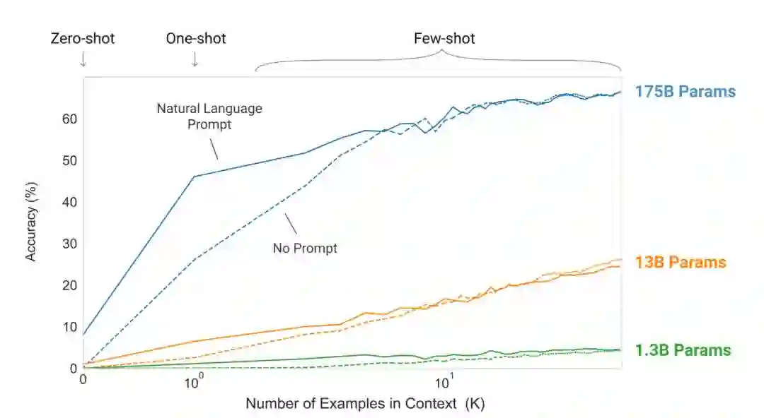 这里的Zero-shot、One-shot、Few-shot都是完全不需要精调的,因为GPT-3是单向transformer,在预测新的token时会对之前的examples进行编码。