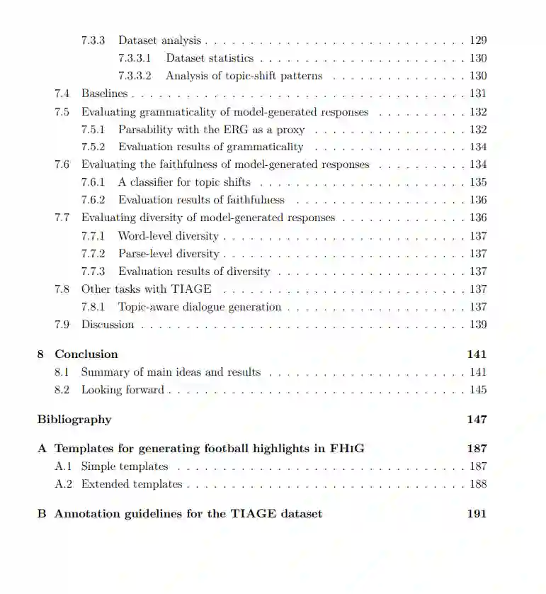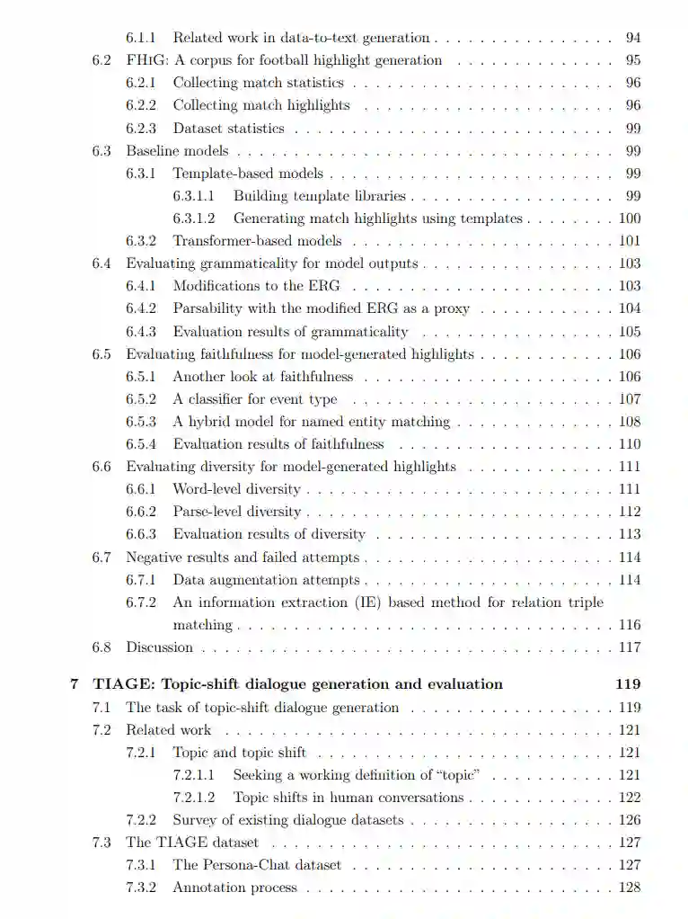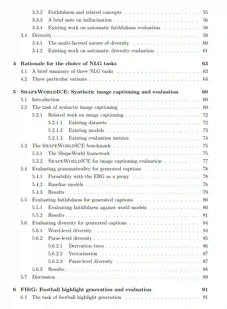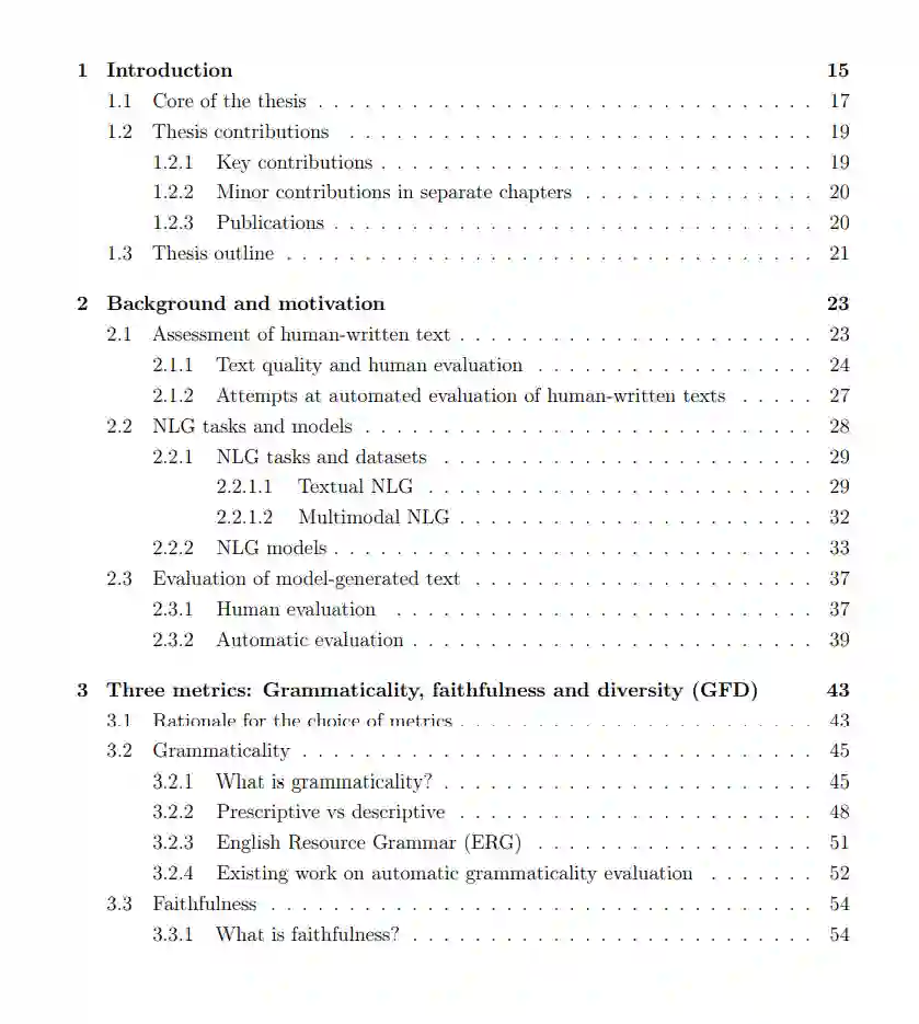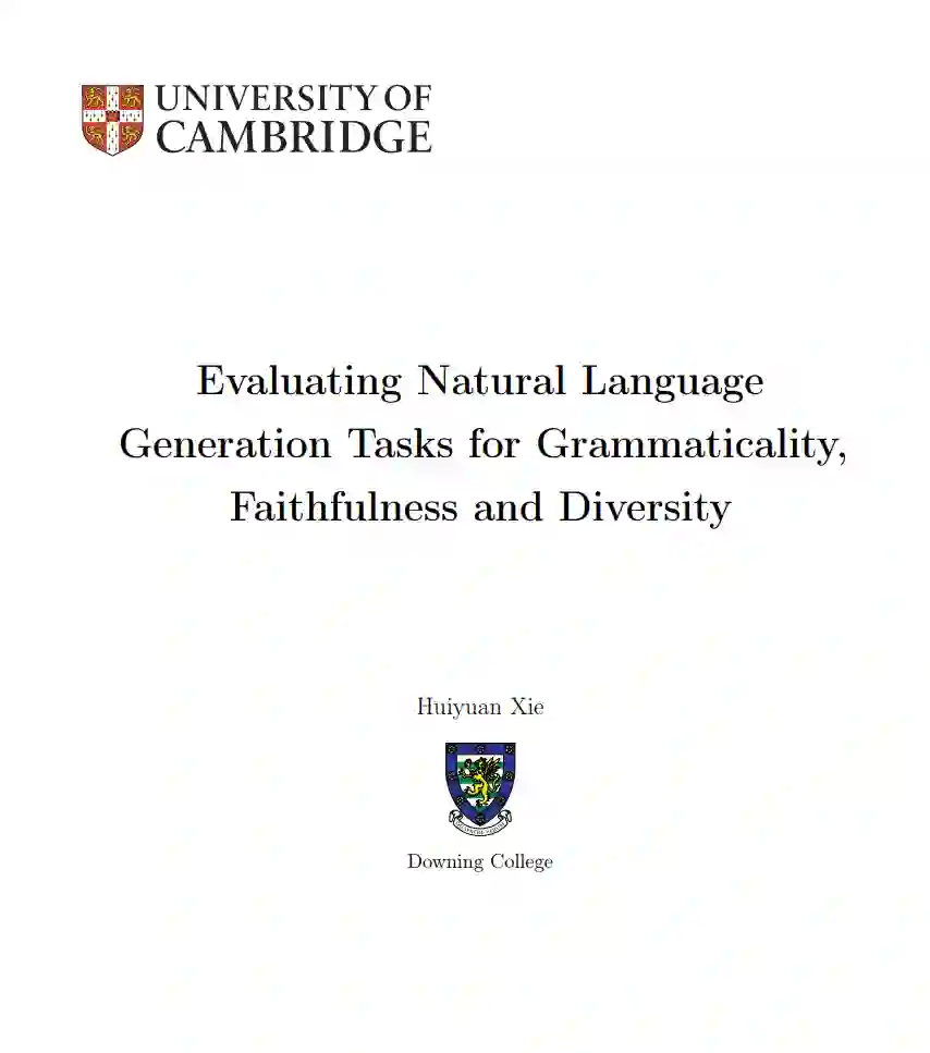 自然语言生成(NLG)在许多应用中发挥着至关重要的作用。评估生成文本的质量对于确保NLG系统的有效性和用户满意度至关重要。随着近年来深度学习的普及,许多模型被报告在流行的基准测试中达到了超越人类的性能。然而,人们观察到,现有的整体基准和评估指标经常未能准确评估该领域感兴趣的特定评估因素。 本论文探索了一个诊断性评估框架,用于评估NLG任务中生成文本的语法性、忠实度和多样性(GFD)。这三个指标被视为基本的语言质量,NLG模型的输出中需要具备这些质量。通过分析句子与明确定义的形式语法的解析性来检查语法性。忠实度被分为两个方面:基于事实的忠实度和任务的忠实度。这两个方面调查模型输出与输入中提供的信息以及任务的固有要求的对齐程度。多样性进一步细分为词级和解析级多样性测量。在提出的GFD框架中,评估这三个指标不需要构建特定于任务的参考资料。