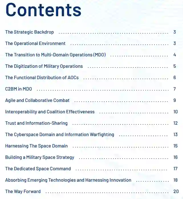本报告通过将关键的作战范式、挑战和战略转型的推动因素相互关联,以向新的作战方式演进,综合了空军向多域作战 (MDO) 过渡的最新观点。