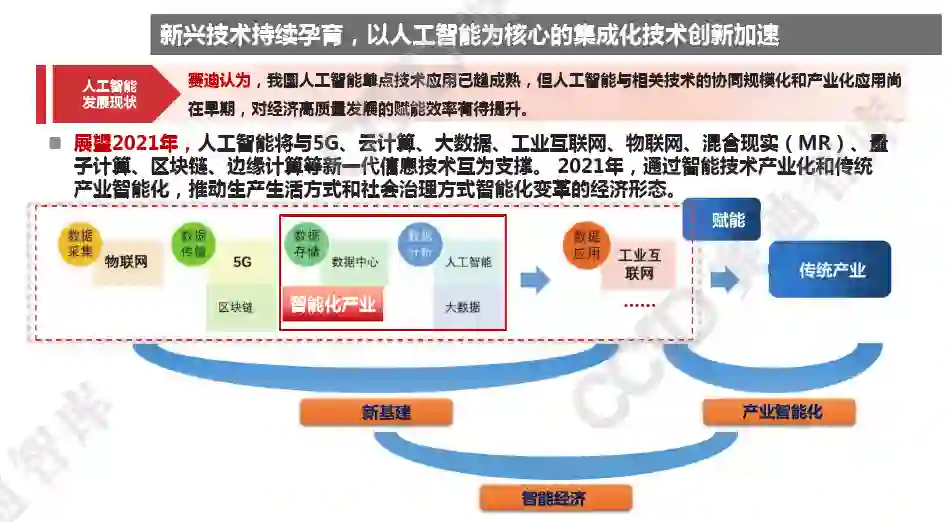 2017至2019年,连续三年的政府工作报告中均提及加快人工智能产业发展;2020年,人工智能更是与SG基站、大数据中心、工业互联网等一起被列入新基建范围。在 “新基建“ 背景下,人工智能将为智能经济的发展和产业数字化转型提供底层支撑, 推动人工智能与SG、云计算、大数据、物联网等领域深度融合。