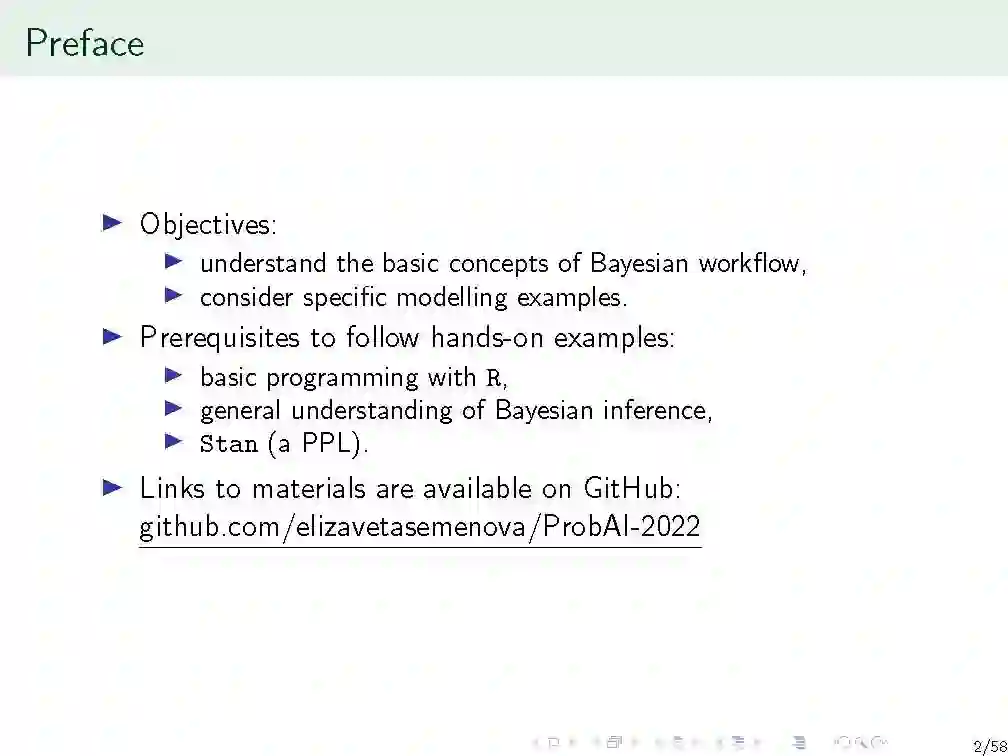 数据分析的贝叶斯方法提供了一种使用概率论处理所有观测、模型参数和模型结构中的不确定性的强大方法。概率编程语言使指定和拟合贝叶斯模型变得更容易,但这仍然给我们留下了许多关于构建、评估和使用这些模型的选择,以及计算中的许多剩余挑战。使用贝叶斯推理解决现实世界的问题不仅需要统计技能、主题知识和编程,还需要了解在数据分析过程中所做的决策。所有这些方面都可以理解为应用贝叶斯统计的复杂工作流程的一部分。除了推理,该工作流程还包括迭代模型构建、模型检查、计算问题的验证和故障排除、模型理解和模型比较。我们在几个例子的背景下回顾了工作流的所有这些方面,记住在实践中,我们将为任何给定的问题拟合许多模型,即使只有其中的一个子集最终与我们的结论相关。