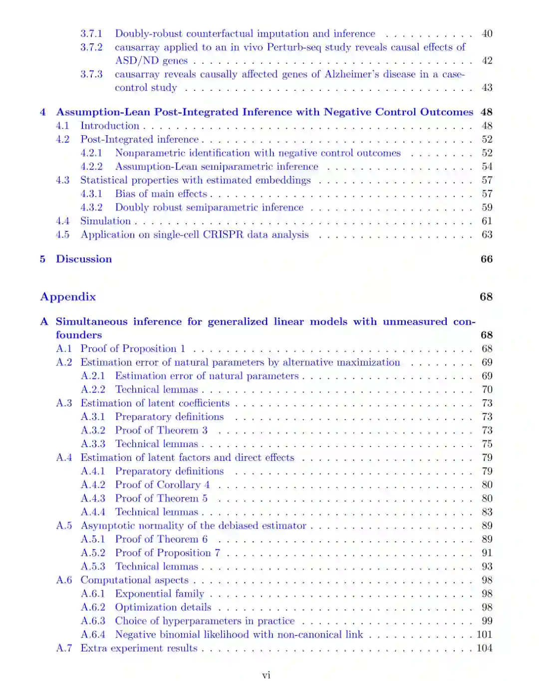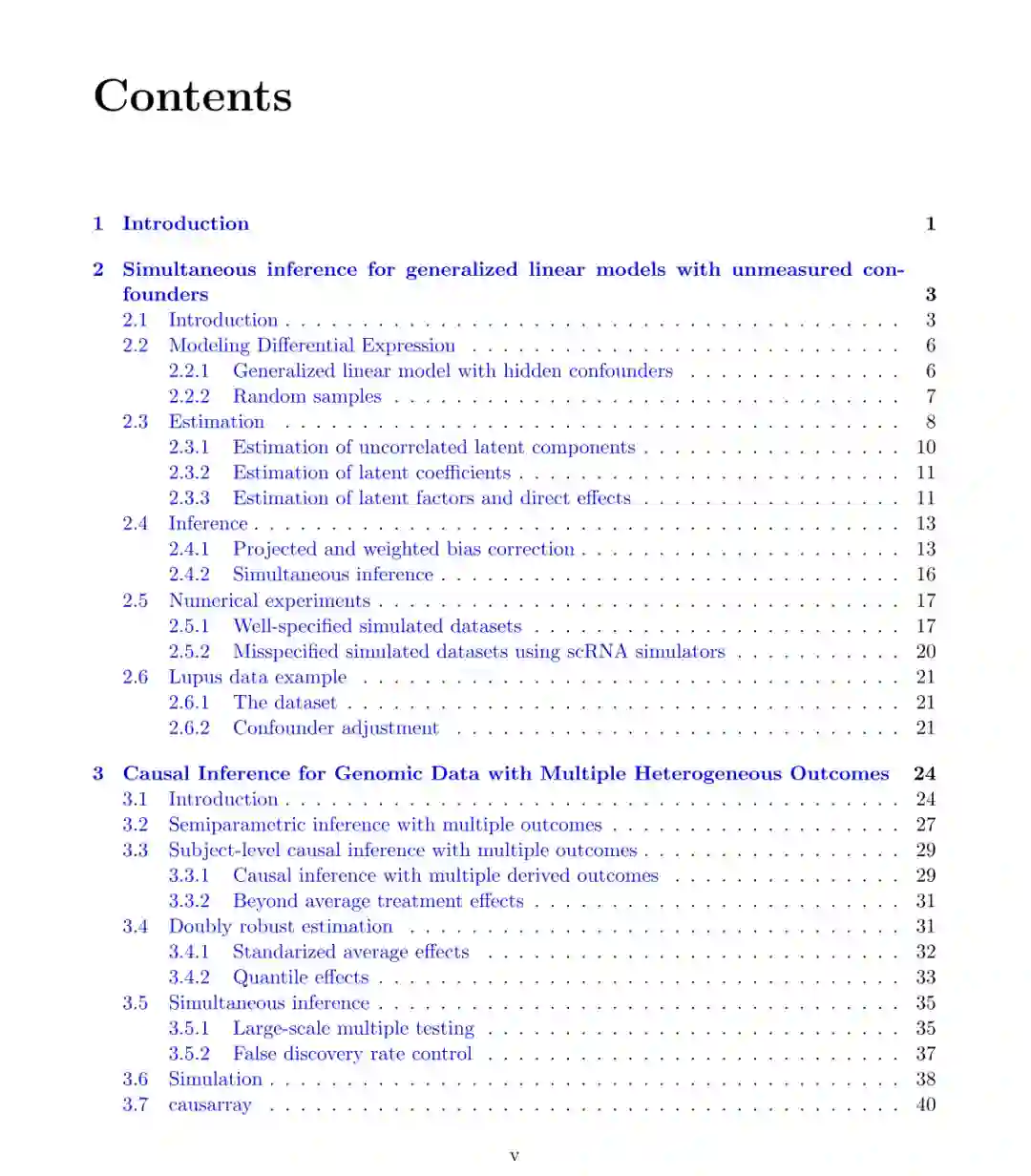 在基因组学研究中,通常会进行成千上万次的统计假设检验,以识别受疾病因果影响的基因。近年来,单细胞RNA测序和CRISPR技术的进展使得基因表达可以被高分辨率地测量。然而,这些数据往往是稀疏的、过度离散的,并且具有异质性,这对多个因果效应的可靠推断带来了重大挑战。 本论文提出了三种互补的解决方案: (1) GCATE 是一个统一的建模框架,适用于具有潜在混杂因素的广义线性模型。通过利用正交结构与线性投影,GCATE 能够在非线性模型下一致地估计和推断直接效应。在样本量和响应变量维度同时趋于无穷的高维情形下,我们推导了渐近 z 检验的一类错误控制,并实证展示了Benjamini-Hochberg程序的虚假发现率控制能力。通过比较两个样本组的单细胞RNA-seq 计数,验证了当显著协变量缺失时调整混杂效应的适用性。 (2) causarray 将来自 GCATE 的混杂因子估计与一个用于多个导出结果的半参数框架相结合。该方法超越了平均处理效应的估计,支持稳健因果估计量,并允许利用机器学习进行灵活建模。由此构建的双重稳健推理流程可以维持 FDR 或 FDX 控制。在自闭症风险基因的 in vivo Perturb-seq 筛选实验和三个阿尔茨海默症转录组数据集上的应用表明,该方法揭示了与疾病相关的神经通路聚类结构。 (3) PII 提供了一种假设依赖性较低的后整合推断方法,利用负控制结果调整潜在异质性。所得的双重稳健估计量在较弱条件下实现一致性与高效性,使得在整合机器学习后可进行数据自适应的因果推断。我们通过随机森林仿真评估其经验性能,并进一步在具有潜在未观测混杂因素的单细胞CRISPR数据集中进行了验证。 总体而言,这些方法构成了一套严谨的因果推理工具包,适用于复杂的基因组环境,能够应对非高斯性、异质性、高维性和未观测混杂问题,从而实现与疾病相关基因和通路的可靠发现。