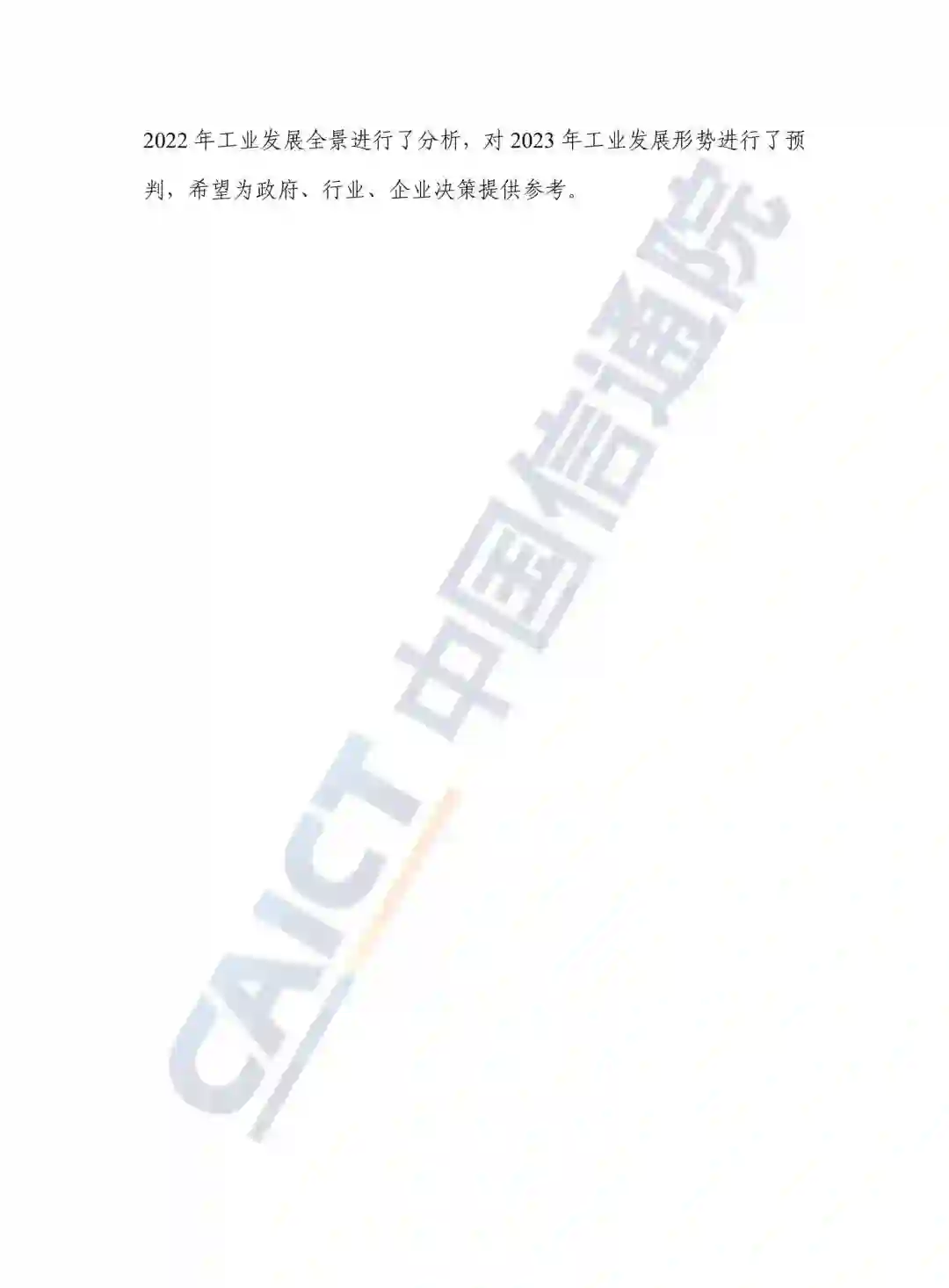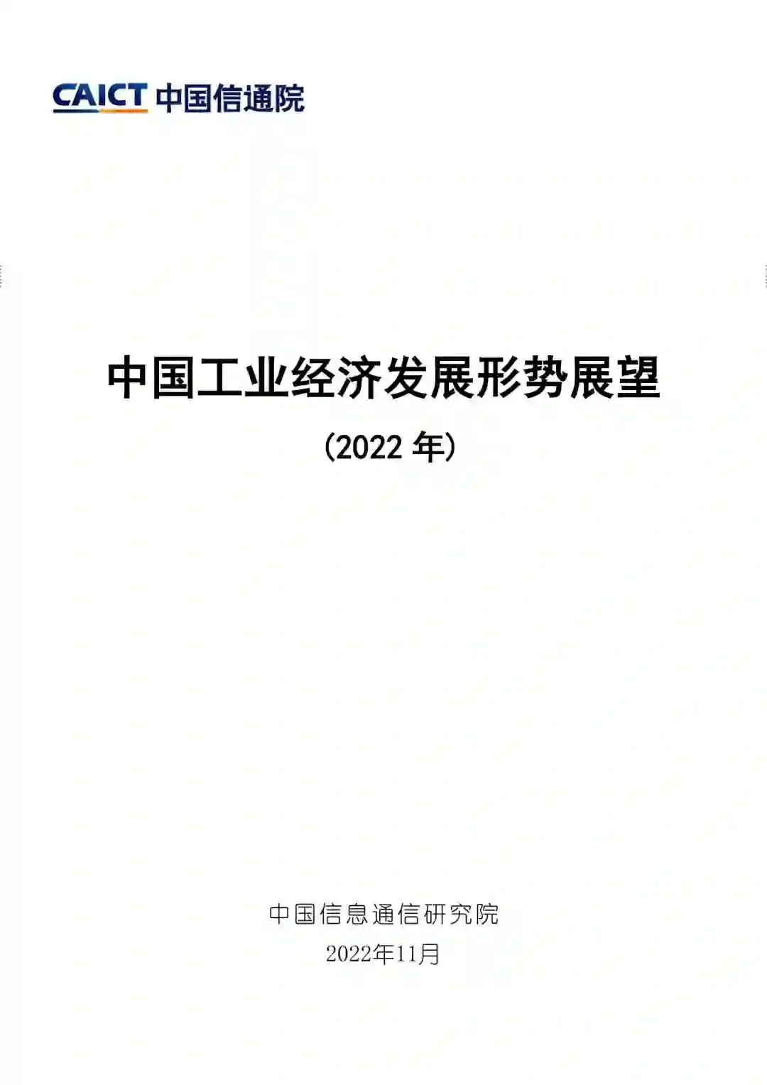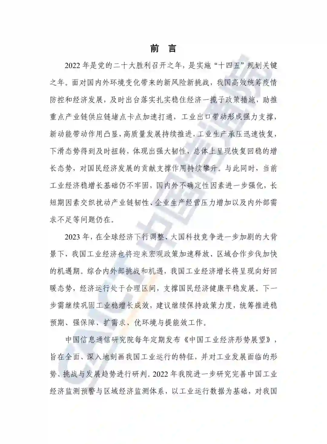 2023年,在全球经济下行调整、大国科技竞争进一步加剧的大背景下,我国工业经济也将迎来宏观政策加速释放、区域合作步伐加快的机遇期。综合内外部挑战和机遇,我国工业经济增长将呈现向好回暖态势,经济运行处于合理区间,支撑国民经济健康平稳发展。下一步需继续巩固工业稳增长成效,建议继续保持政策力度,统筹推进稳预期、强保障、扩需求、优环境与提能效工作。 中国信息通信研究院每年定期发布《中国工业经济形势展望》,旨在全面、深入地刻画我国工业运行的特征,并对工业发展面临的形势、挑战与发展趋势进行研判。2022年我院进一步研究完善中国工业经济监测预警与区域经济监测体系,以工业运行数据为基础,对我国2022年工业发展全景进行了分析,对2023年工业发展形势进行了预判,希望为政府、行业、企业决策提供参考。