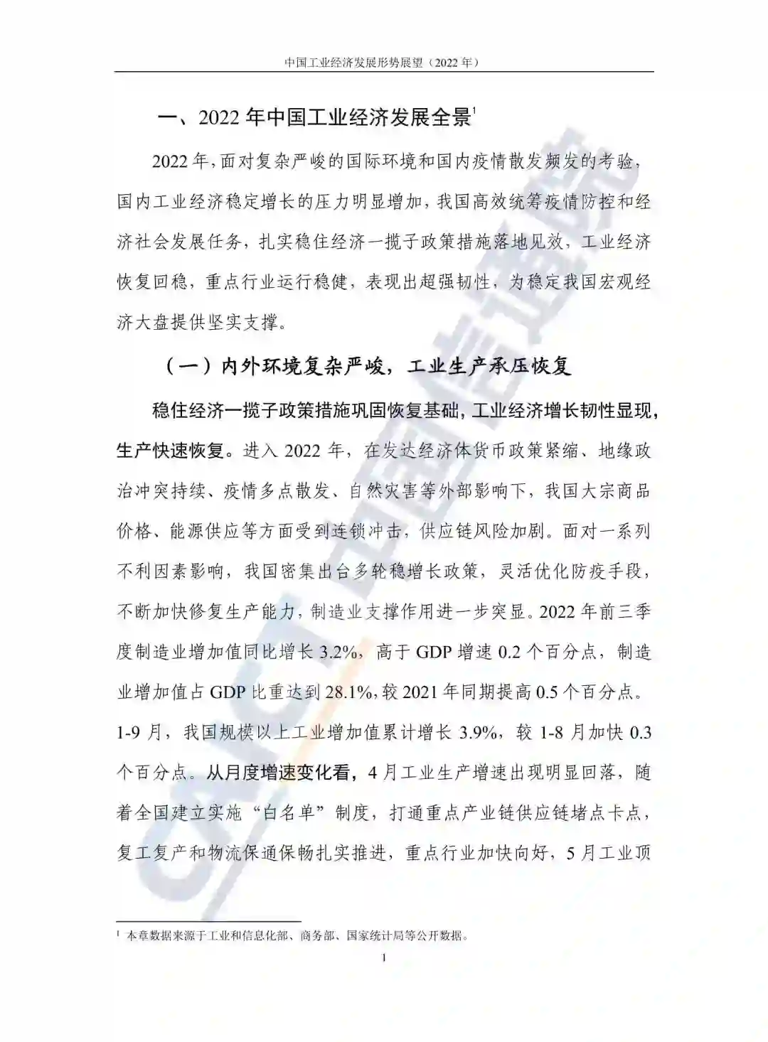 2022年是党的二十大胜利召开之年,是实施“十四五”规划关键之年。面对国内外环境变化带来的新风险新挑战,我国高效统筹疫情防控和经济发展,及时出台落实扎实稳住经济一揽子政策措施,助推重点产业链供应链堵点卡点加速打通,工业出口带动形成强力支撑,新动能带动作用凸显﹐高质量发展持续推进,工业生产承压迅速恢复,下滑态势得到及时扭转,体现出强大韧性,总体上呈现恢复回稳的增长态势,对国民经济发展的贡献支撑作用持续攀升。与此同时,当前工业经济稳增长基础仍不牢固,国内外不确定性因素进一步强化,长短期因素交织扰动产业链韧性、企业生产经营压力增加以及内外部需求不足等问题仍在。