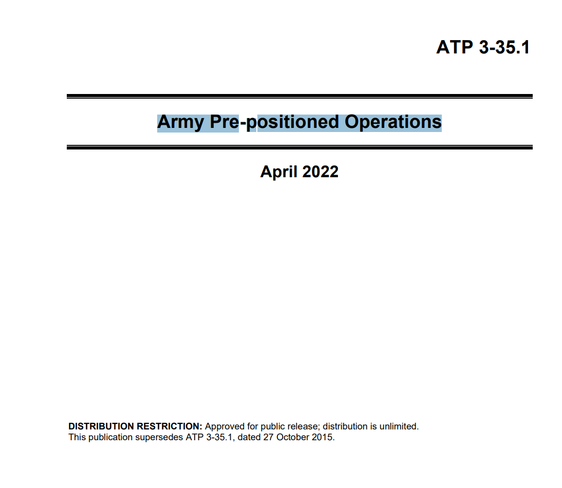 ATP 3-35.1 将战区环境作为组织、事件和活动的重点,这些组织、事件和活动是计划和执行支持兵力投送的陆军预置行动所不可或缺的。作为一支可在全球部署的现代化战备部队,我们的远征军必须有能力在多个领域迅速、持续地开展大规模陆地作战行动,以击败敌人,夺取并控制地形及其相关人口,摧毁对手的抵抗意志。陆军预先部署的储备物资具有快速反应的战略地位,是这一要求和陆军远征能力的关键组成部分。