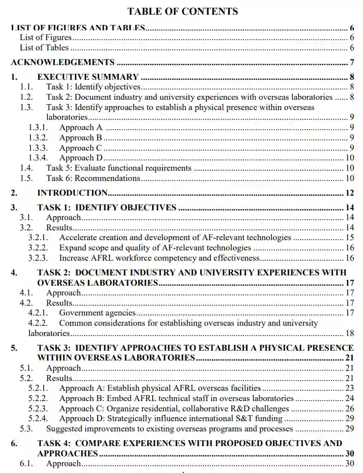 美空军研究实验室(AFRL)的使命是为空中、太空和网络空间部队领导作战技术的发现、开发和交付。为完成这一使命,空军研究实验室需要获得国内外的研发(R&D)和技术人才。美国空军后勤部的国际组合和参与方法很好地利用了国际研发和人才,但仅靠这些方法可能不足以获取越来越多的海外研究成果。为此,美国空军后勤部委托进行了这项研究,以探讨在美国空军后勤部目前的海外办事处(负责考察和资助研发工作)之外,在海外实验室建立强大的实际存在的各种方案。根据这项研究获得的信息,提出了四项主要建议: 2) 扩大、简化和充分利用各种方法,将 AFRL 技术人员嵌入海外实验室;3) 开展国际合作,应对驻地研发挑战;以及 4) 不寻求影响国际科技资金的方法。
