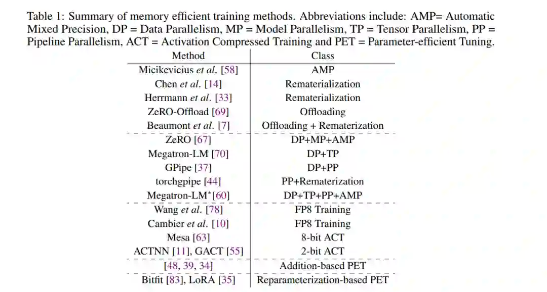 除了计算负担之外,大型Transformer模型的模型规模越来越大,例如从BERT [43] 345M参数模型到1.75万亿参数的GPT-3,这是训练的一个关键瓶颈,因为它们不适合单个设备的存储。我们首先分析了现有模型训练框架的内存消耗,它被1)模型状态所占用,包括优化器状态(例如Adam中的动量和方差)、梯度和参数;2)激活(我们忽略了临时缓冲区和空闲碎片存储,因为它们相对较小)。我们在表1中总结了记忆有效的训练方法。下面,我们将讨论优化存储使用的主要解决方案。