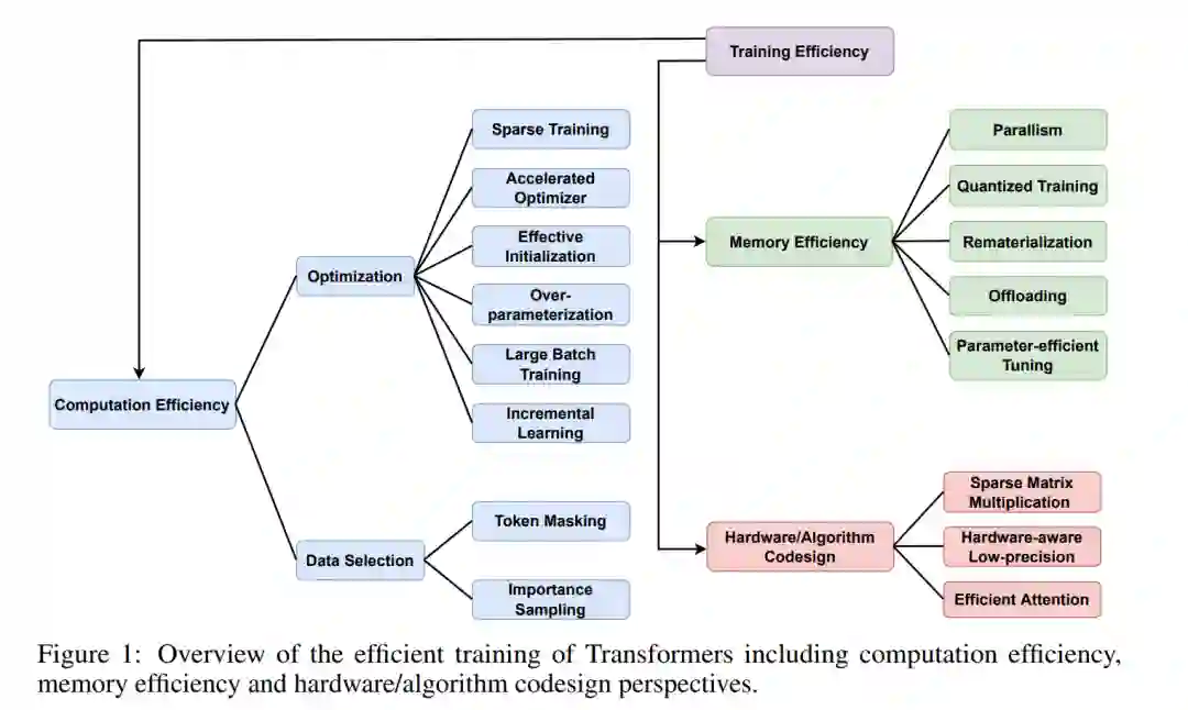 本综述首次系统地概述了transformer的高效训练,涵盖了加速算法和硬件方面的最新进展,重点是前者。我们分析和比较了在训练期间节省中间张量计算和存储成本的方法,以及硬件/算法协同设计的技术。最后讨论了面临的挑战和未来的研究方向。